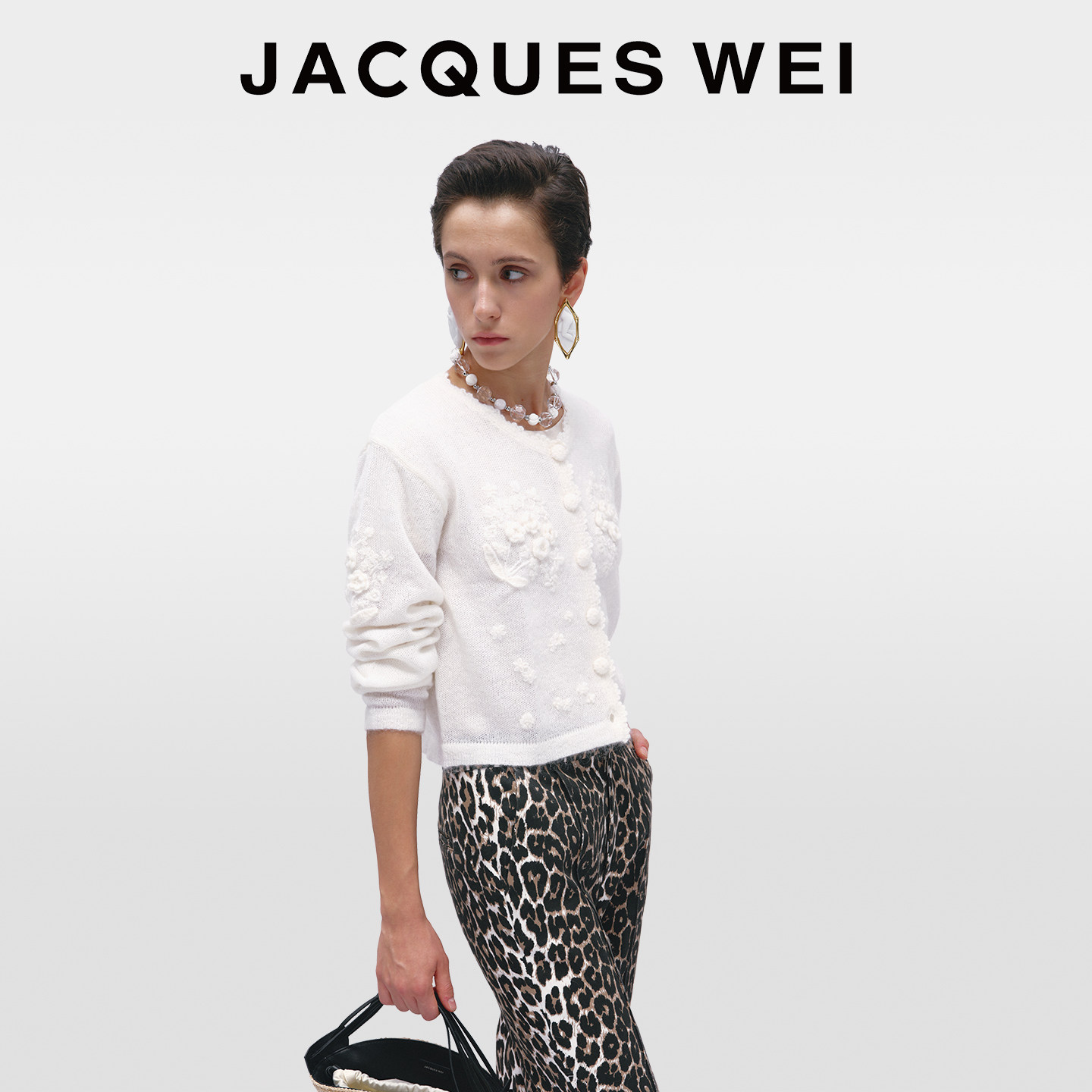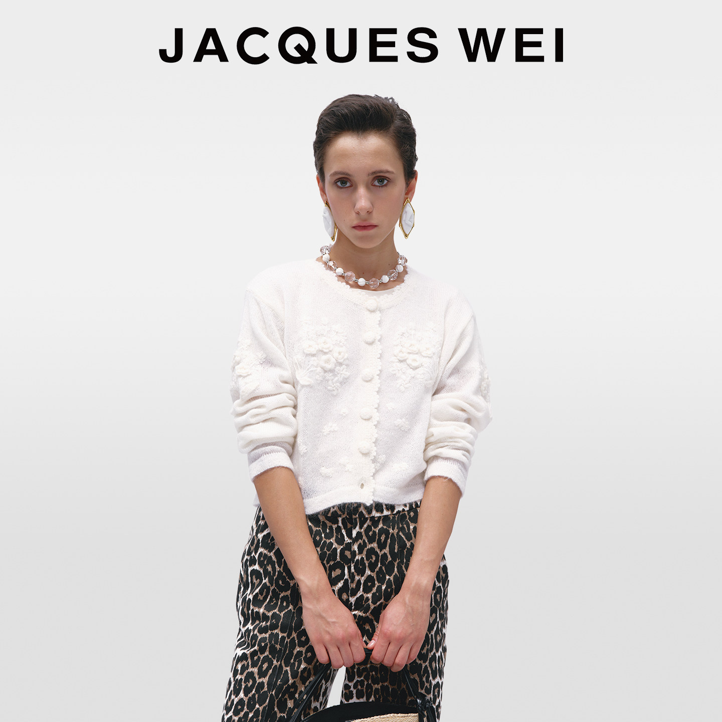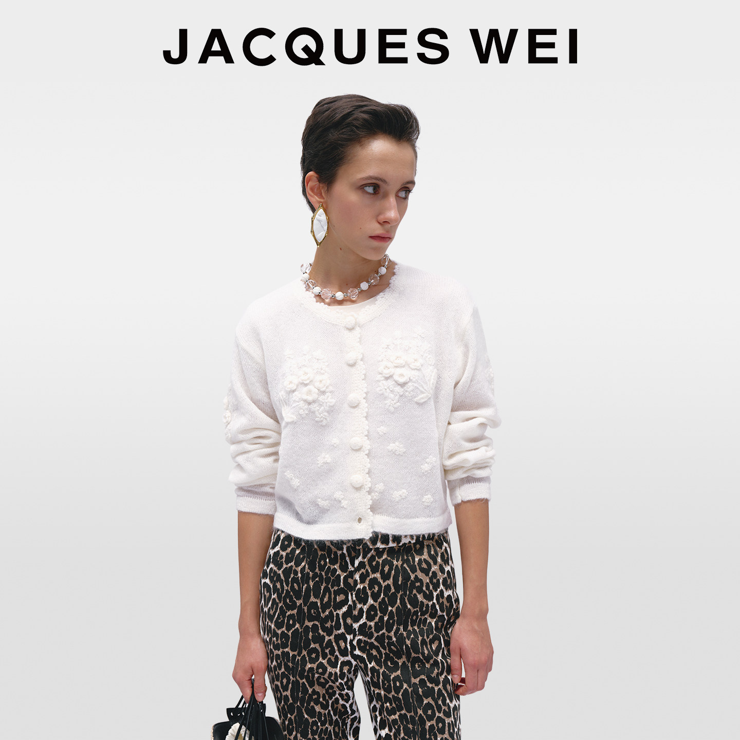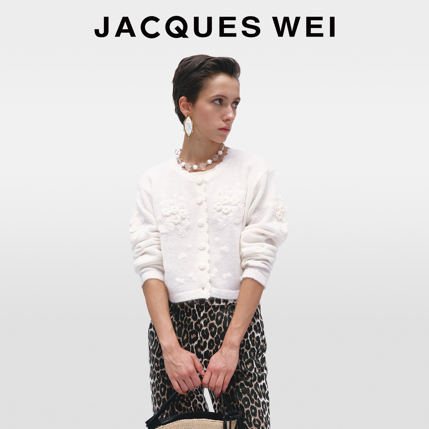 JACQUES WEI 秋冬新款设计师款白色马海毛手工钩花复古毛衣女开衫