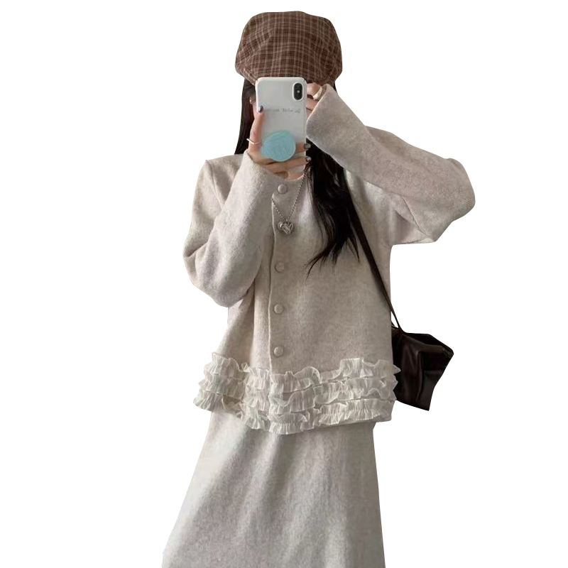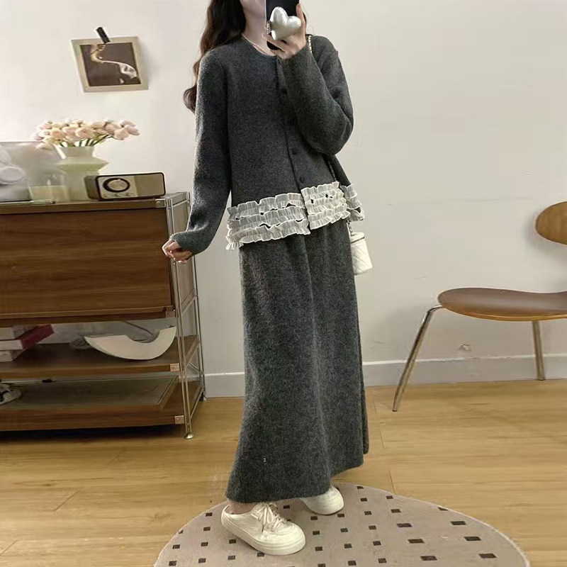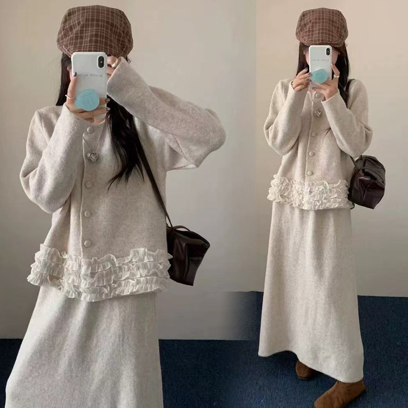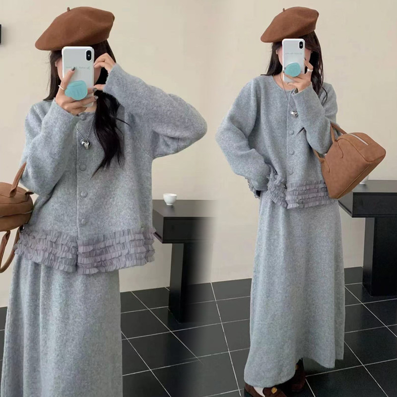 婧麒孕妇装半身裙套装2025新款针织两件套秋冬季木耳边圆领上衣