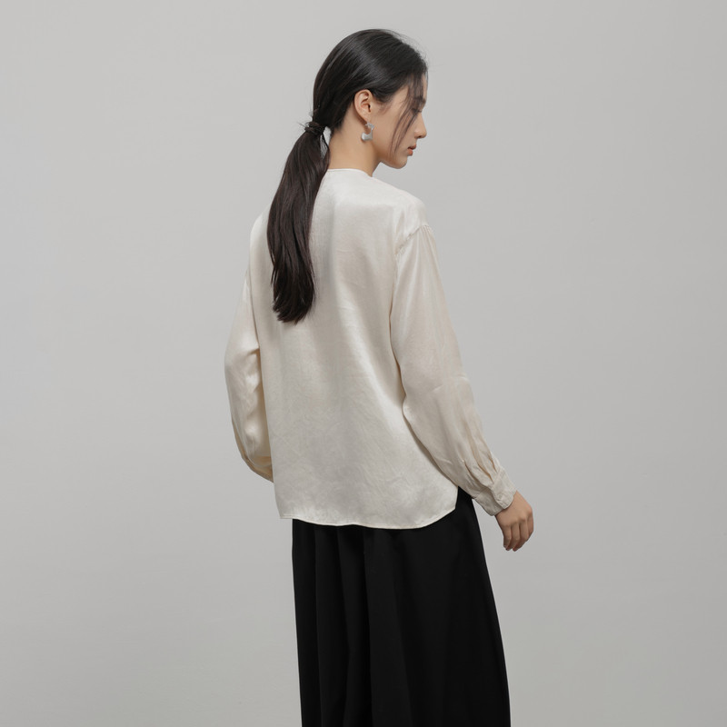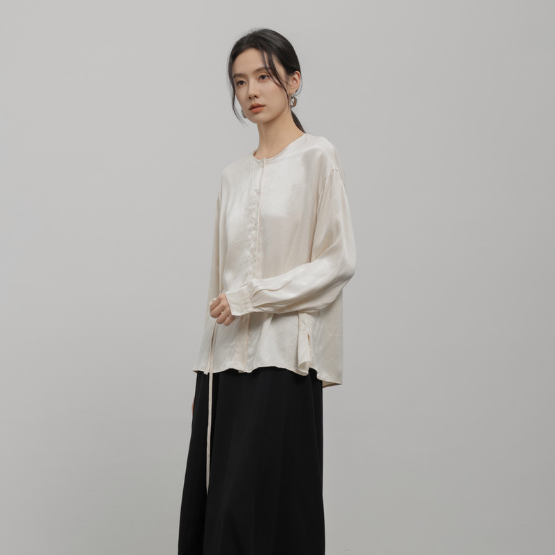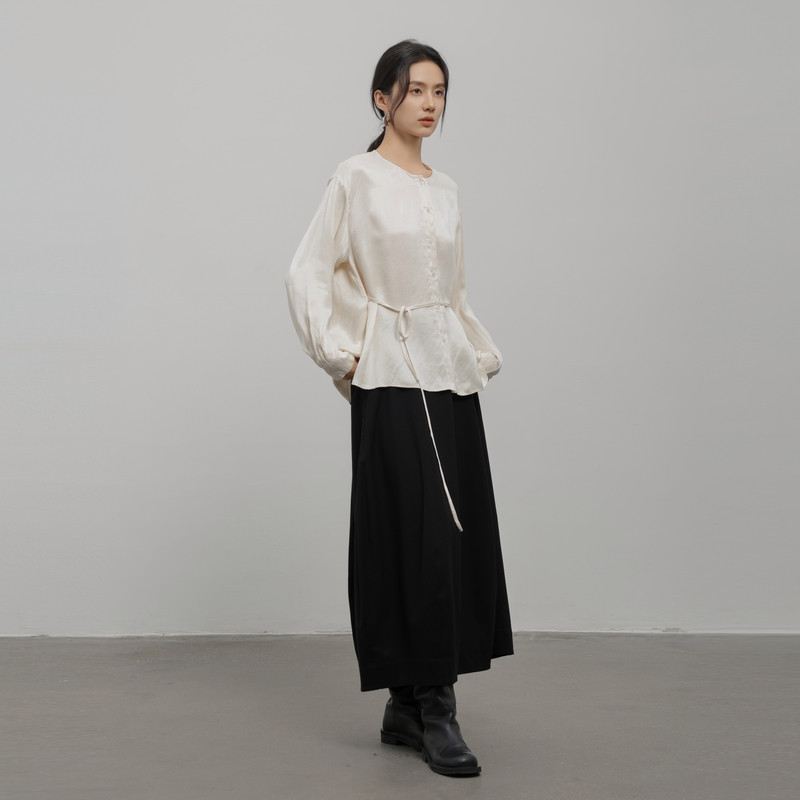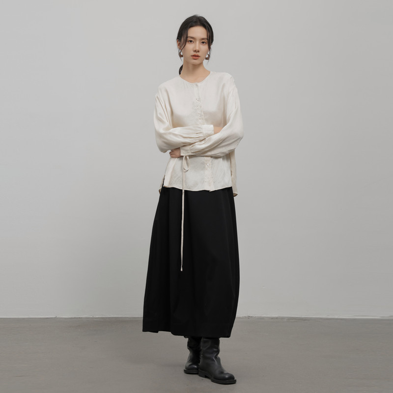 黑标BAIZHUO冬季新款极简圆领抽褶收腰系带长袖天丝衬衫AZ44XS499