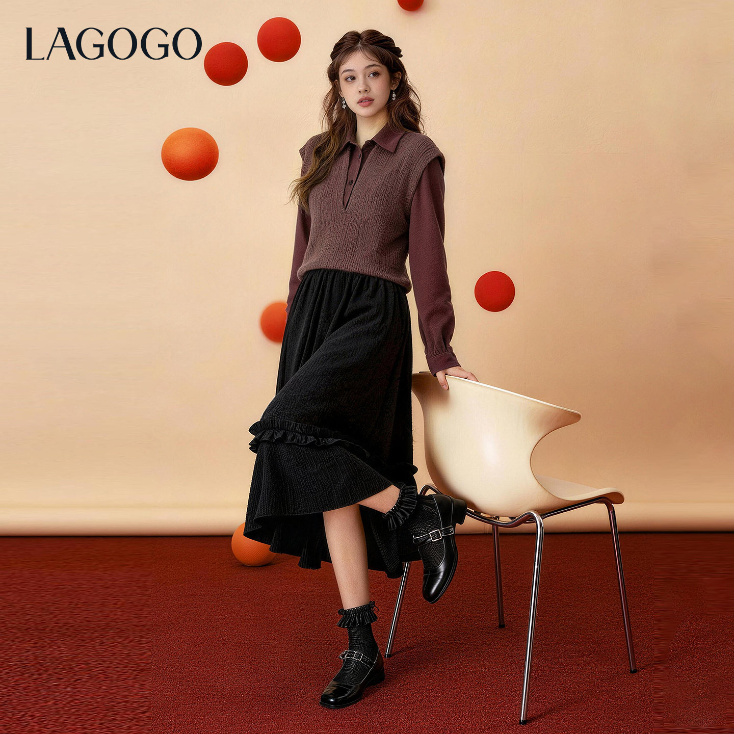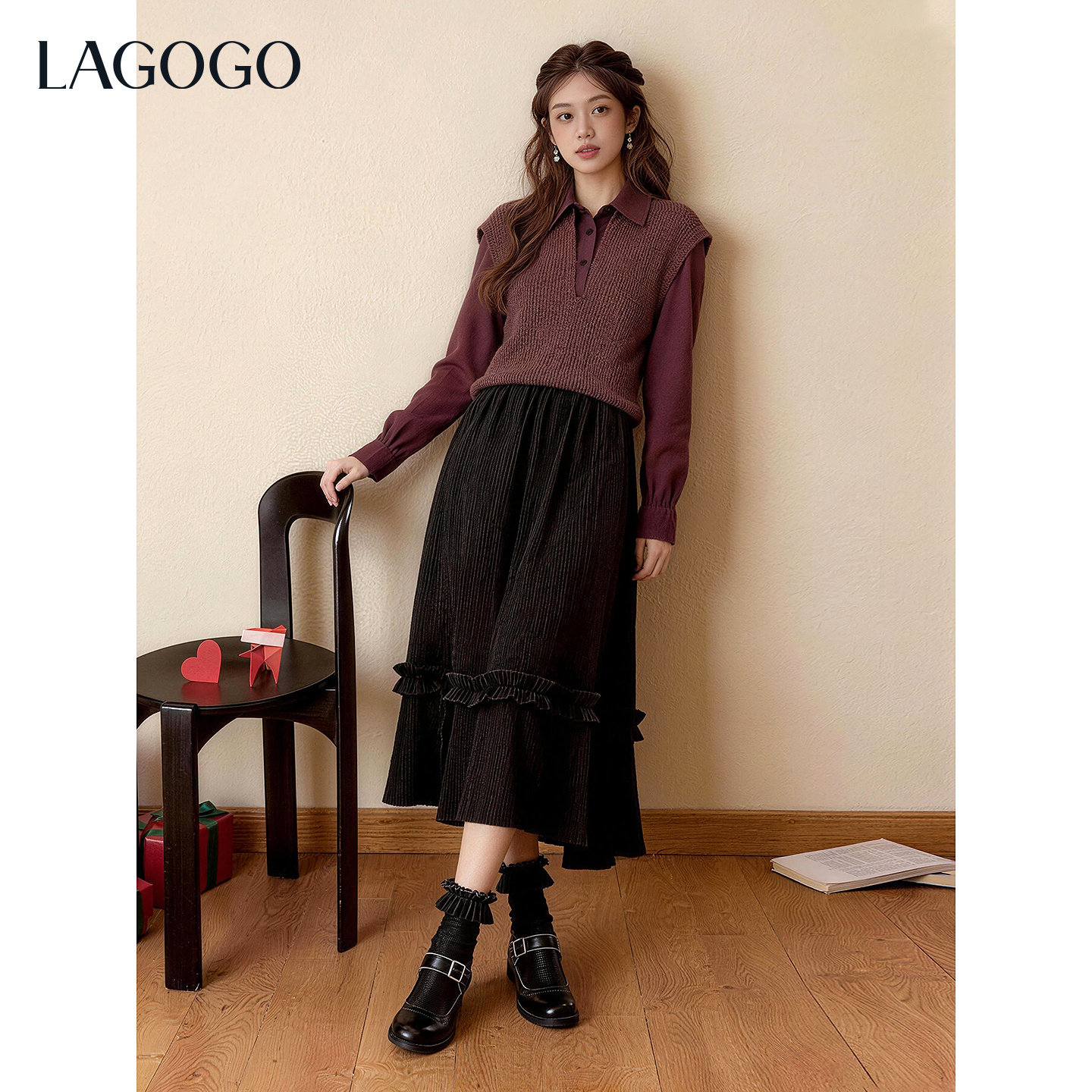 LAGOGO新年氛围丝绒蛋糕半身裙女拉谷谷2025冬季新款黑色花边裙子