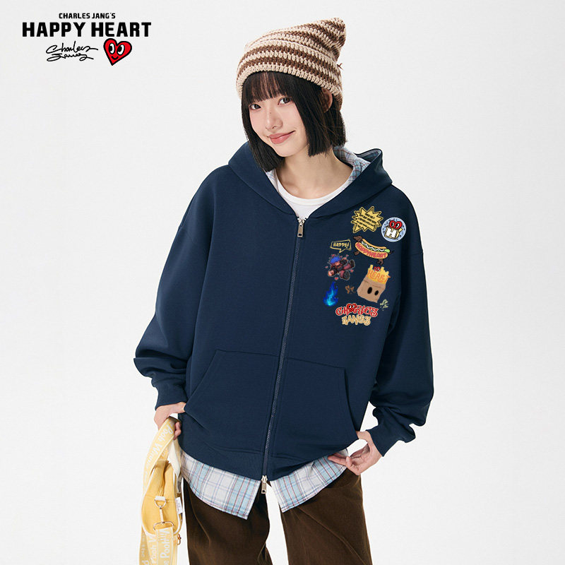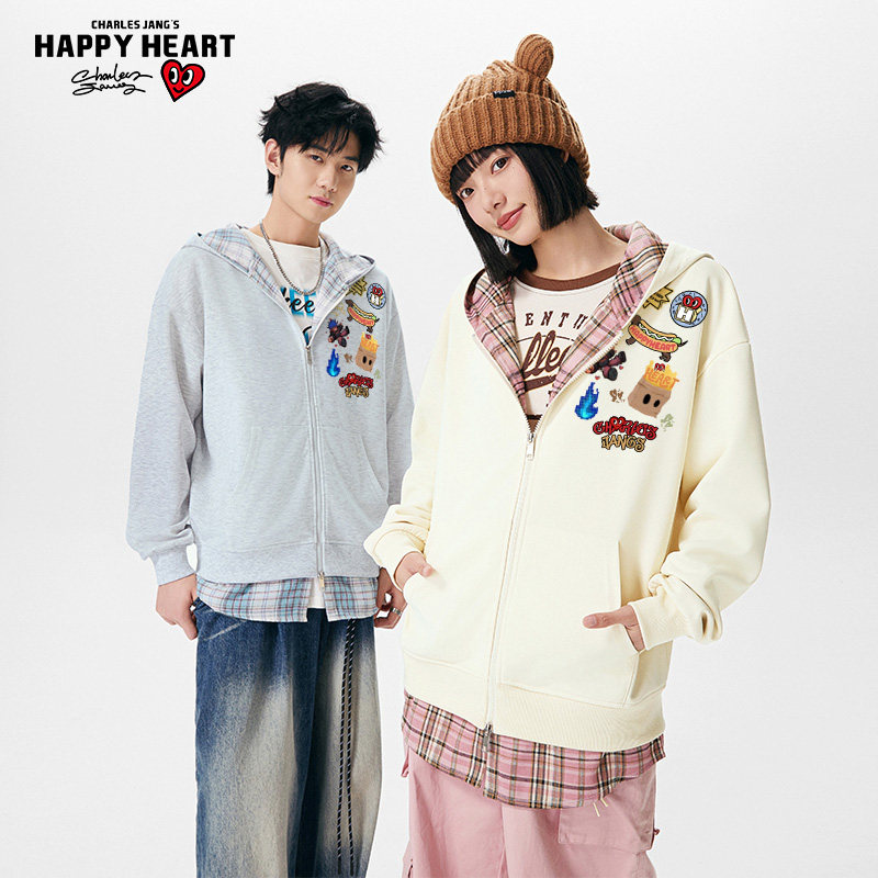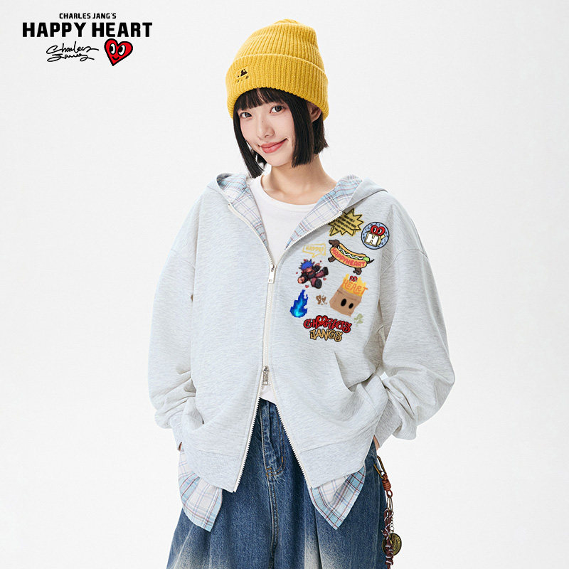 查尔斯桃心美式动漫印花假两件格子开衫卫衣男女秋冬情侣连帽外套