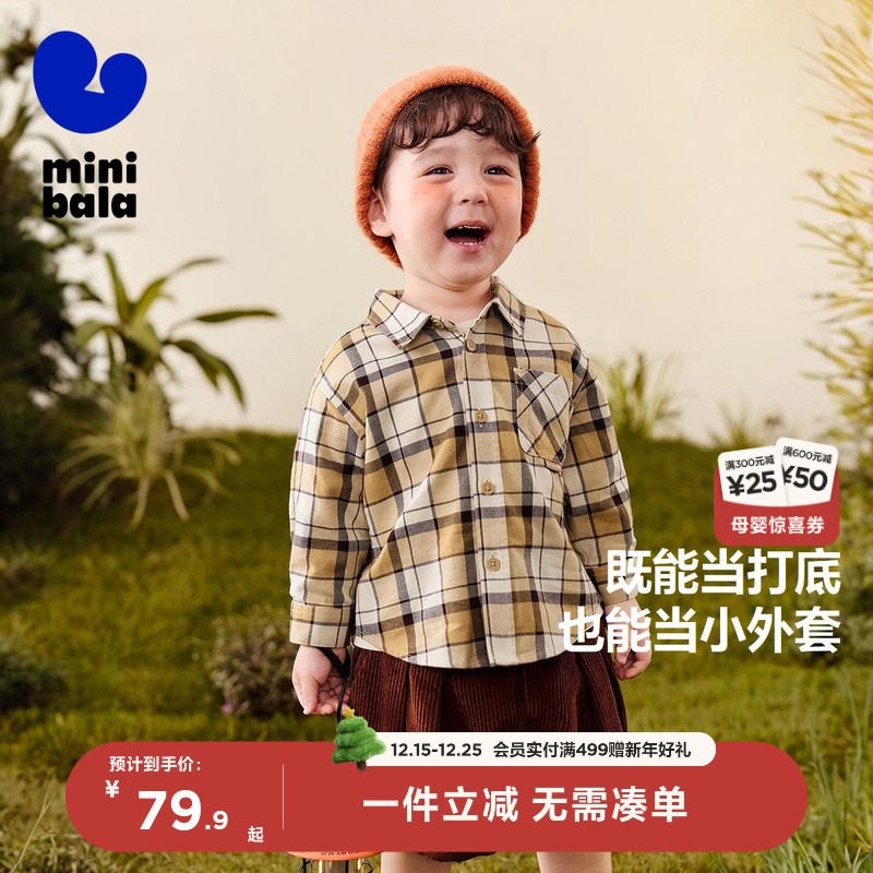 迷你巴拉巴拉男童格子衬衫亲肤2025秋新品儿童长袖宽松宝宝上衣