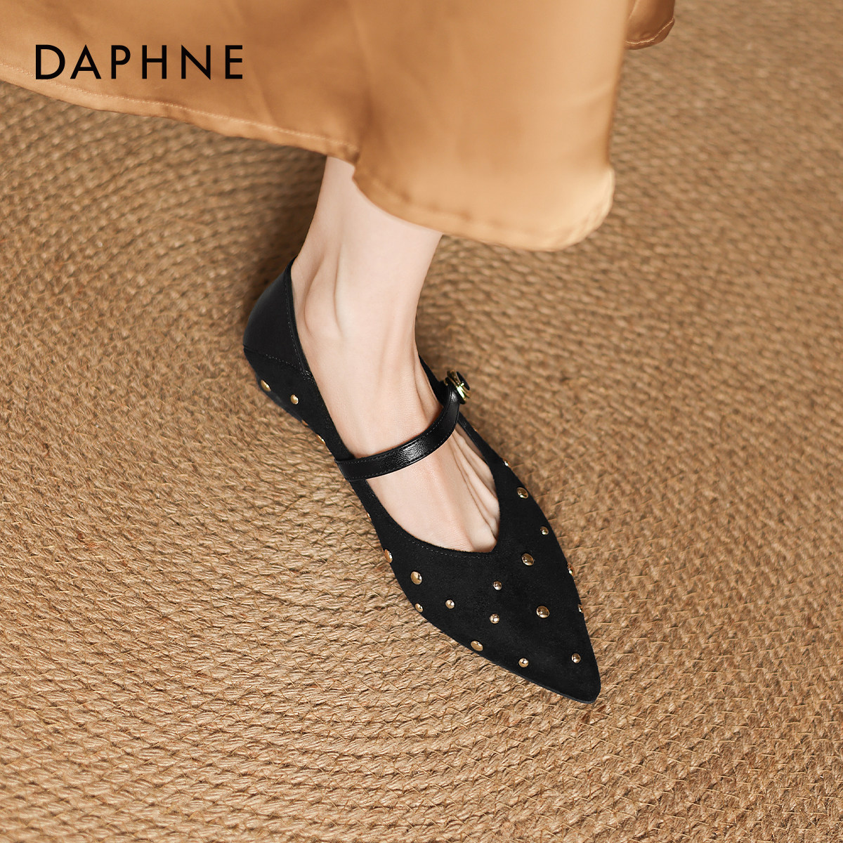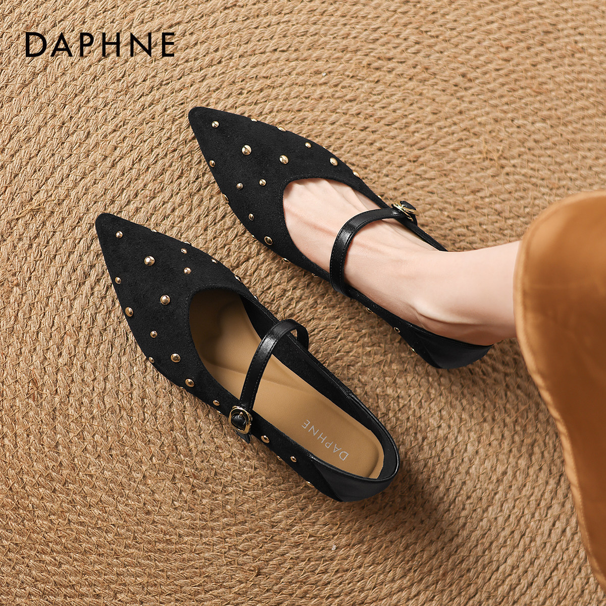 达芙妮平底浅口单鞋女2026春季新款尖头法式小皮鞋铆钉玛丽珍女鞋