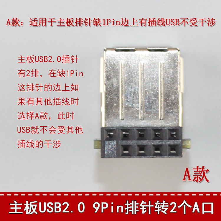 A款/B款台式机主板USB2.09Pin/10Pin插针转A口内置加密狗U顿USB蓝