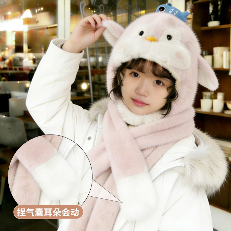 儿童毛绒企鹅帽子宝宝连围巾一捏就会动会叫冬季保暖防寒亲子造型