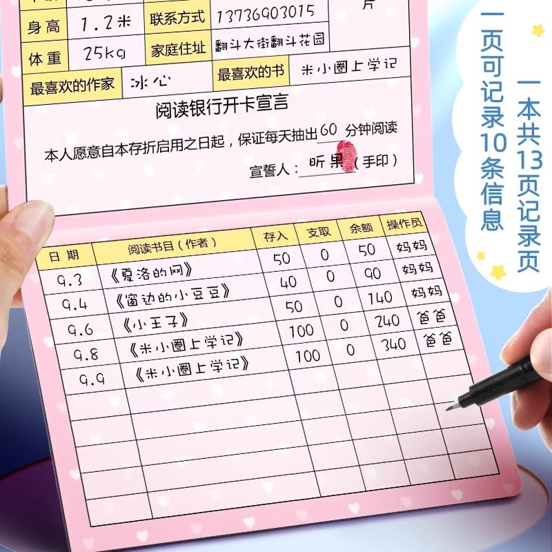 阅读记录本奖励存折少儿读书记录卡儿童积分存折小学生积分奖励册