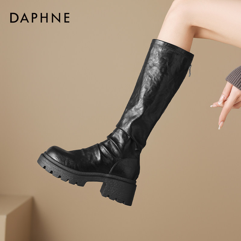 达芙妮厚底长筒靴黑色靴子2026新款爆款加绒堆堆靴骑士小个子长靴