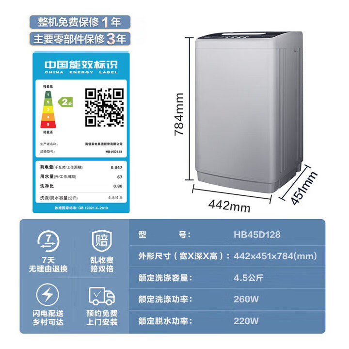 迷你小型洗衣机4.5公斤 母婴儿童全自动 Hisense/海信 HB45D128