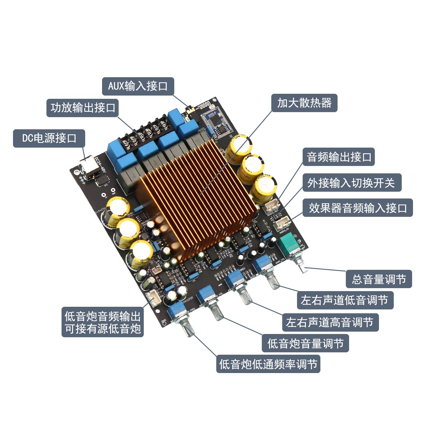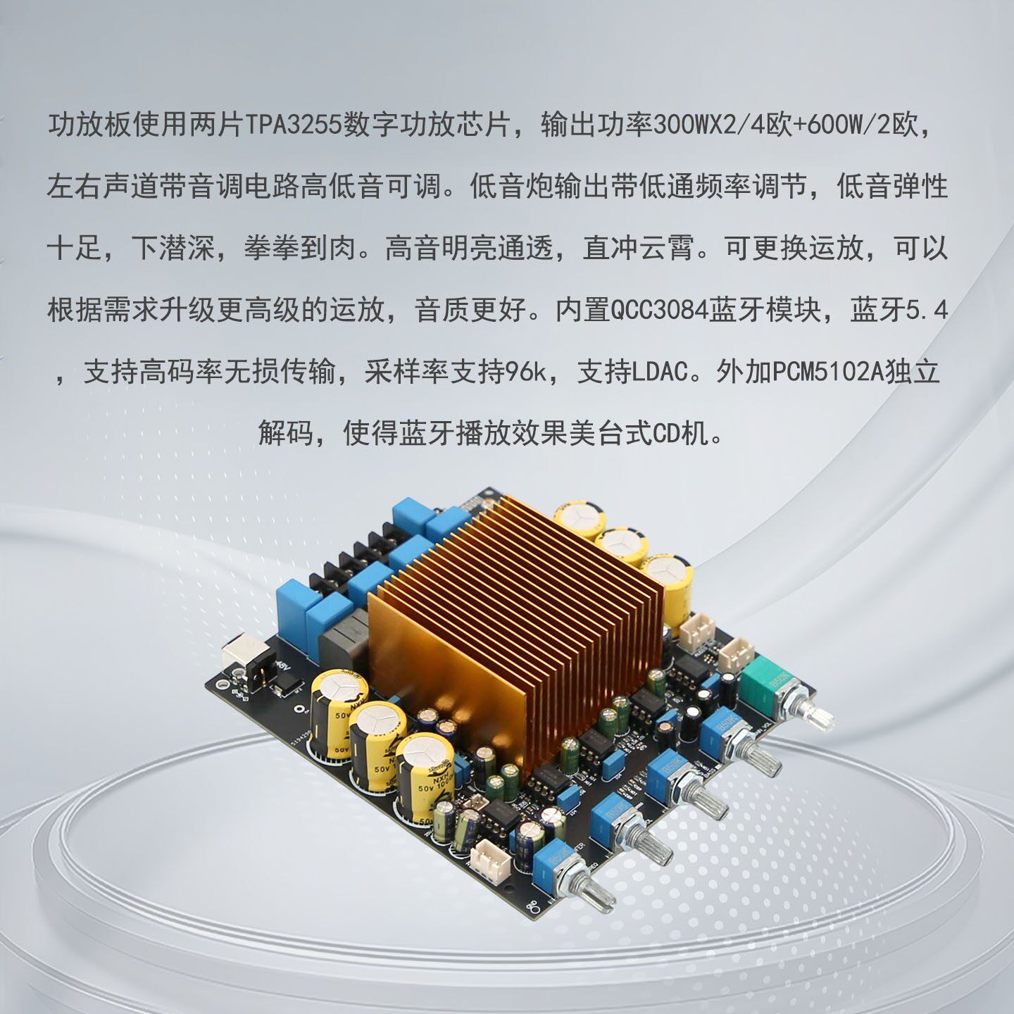 TPA3255大功率HIFI 2.1功放板QCC3084蓝牙5.4 扩展低音炮信号输出
