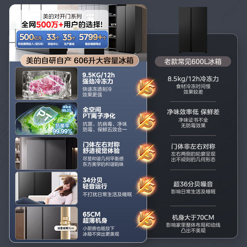 美的570+/606对开双开门两门大容量家用冰箱一级节能风冷无霜超薄