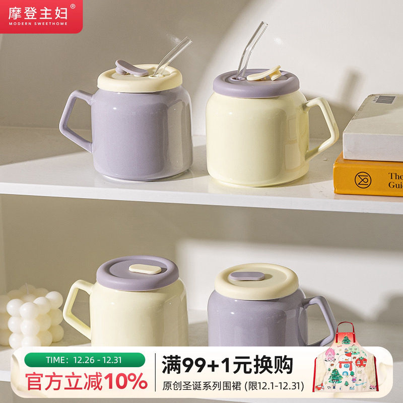 摩登主妇高颜值陶瓷马克杯女咖啡杯家用喝水杯办公室带盖吸管杯子