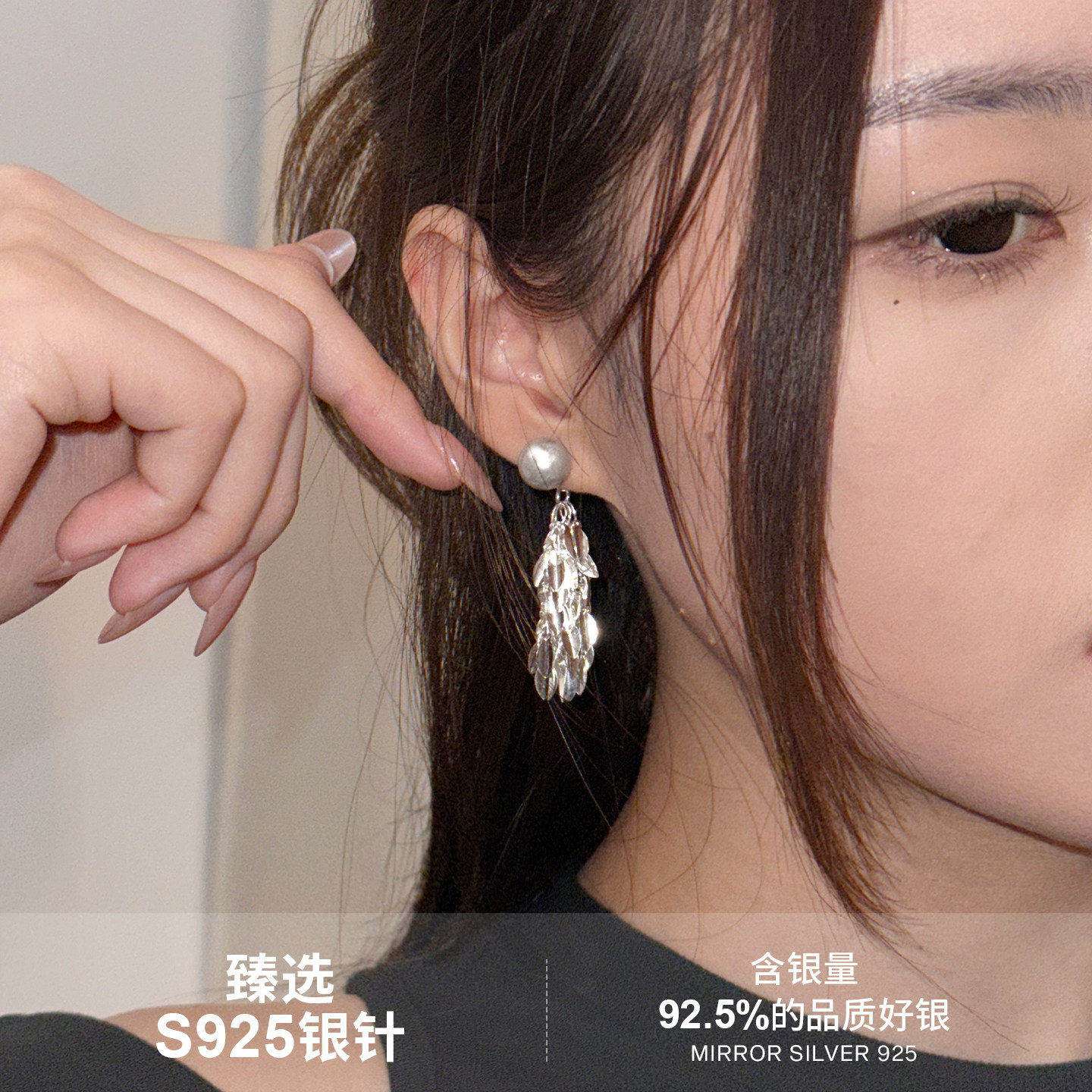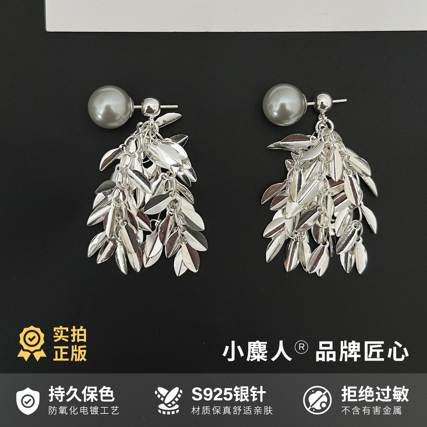 小麋人925纯银耳针叶片流苏母贝珍珠耳钉女耳环耳饰气质时尚新款