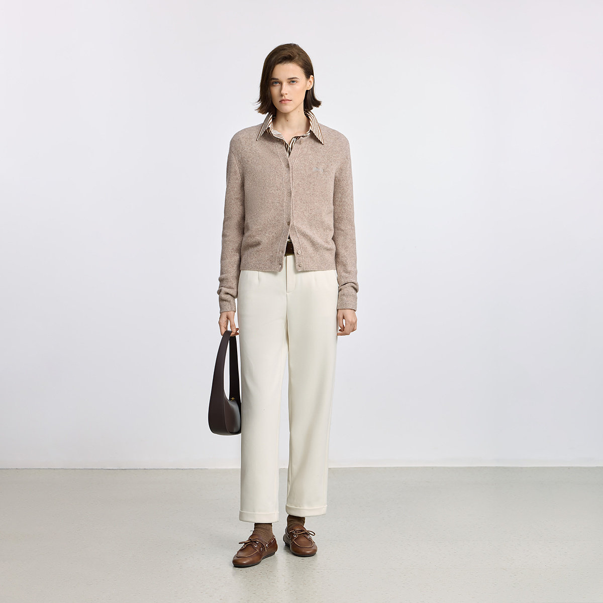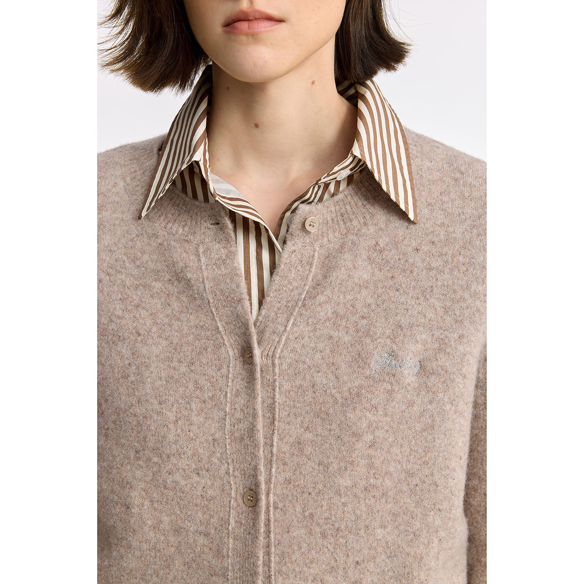 LILY2025冬新款羊毛混纺圆领撞色绣花休闲通勤驼色针织开衫短款女
