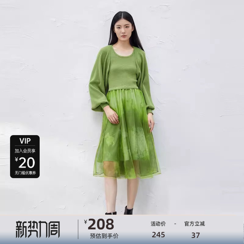 sdeer圣迪奥女装秋晕染网纱针织背心连衣裙套装S23381402