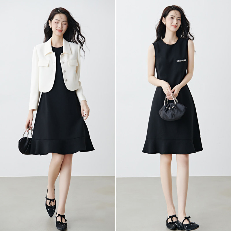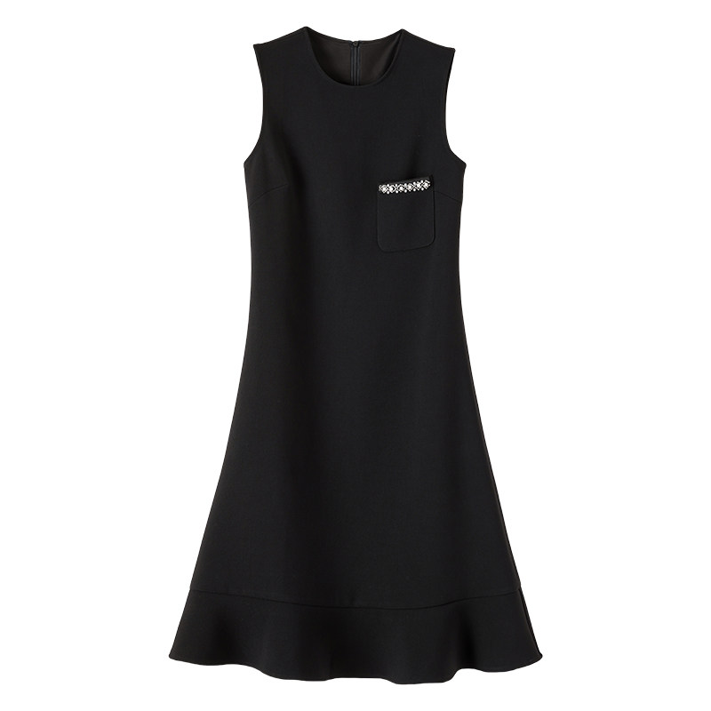 晚白2026年春季新款时尚钉珠圆领裙子小个子气质百搭无袖连衣裙