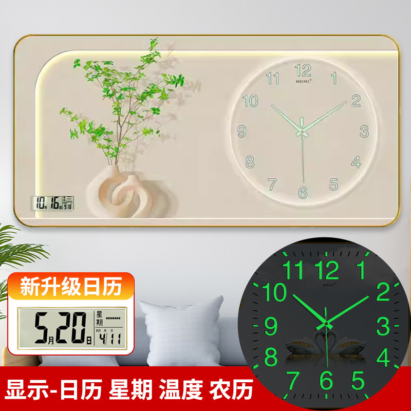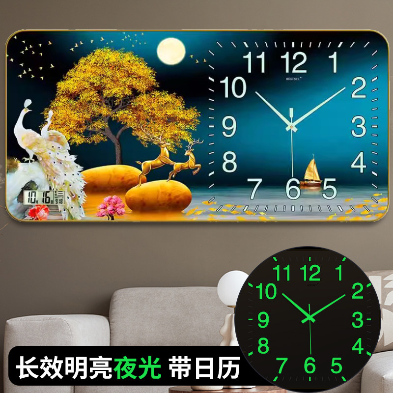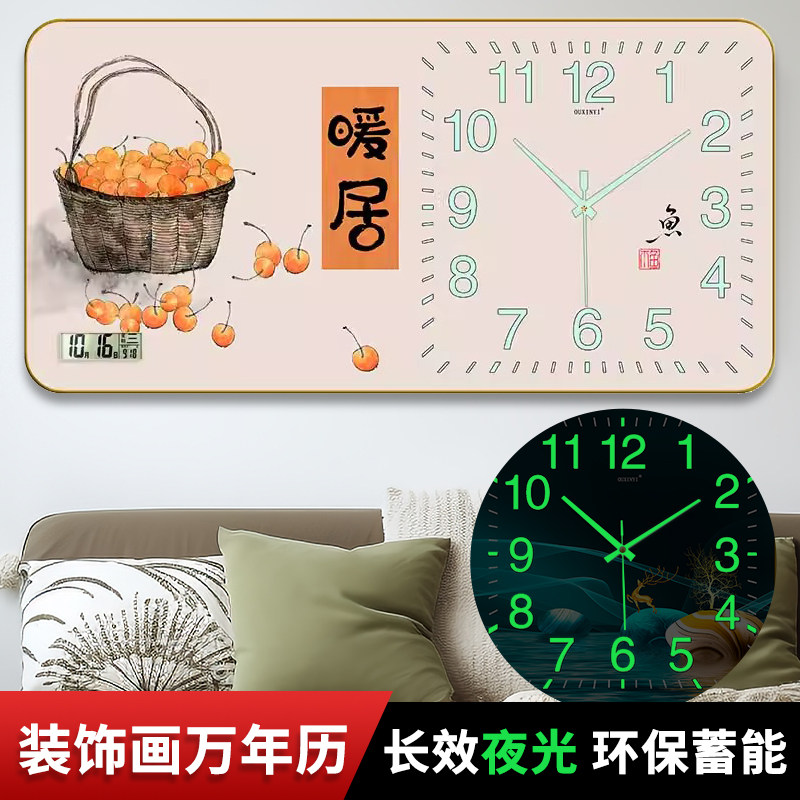 柿柿如意餐厅装饰画2025新款电子钟表万年历静音客厅创意夜光挂钟