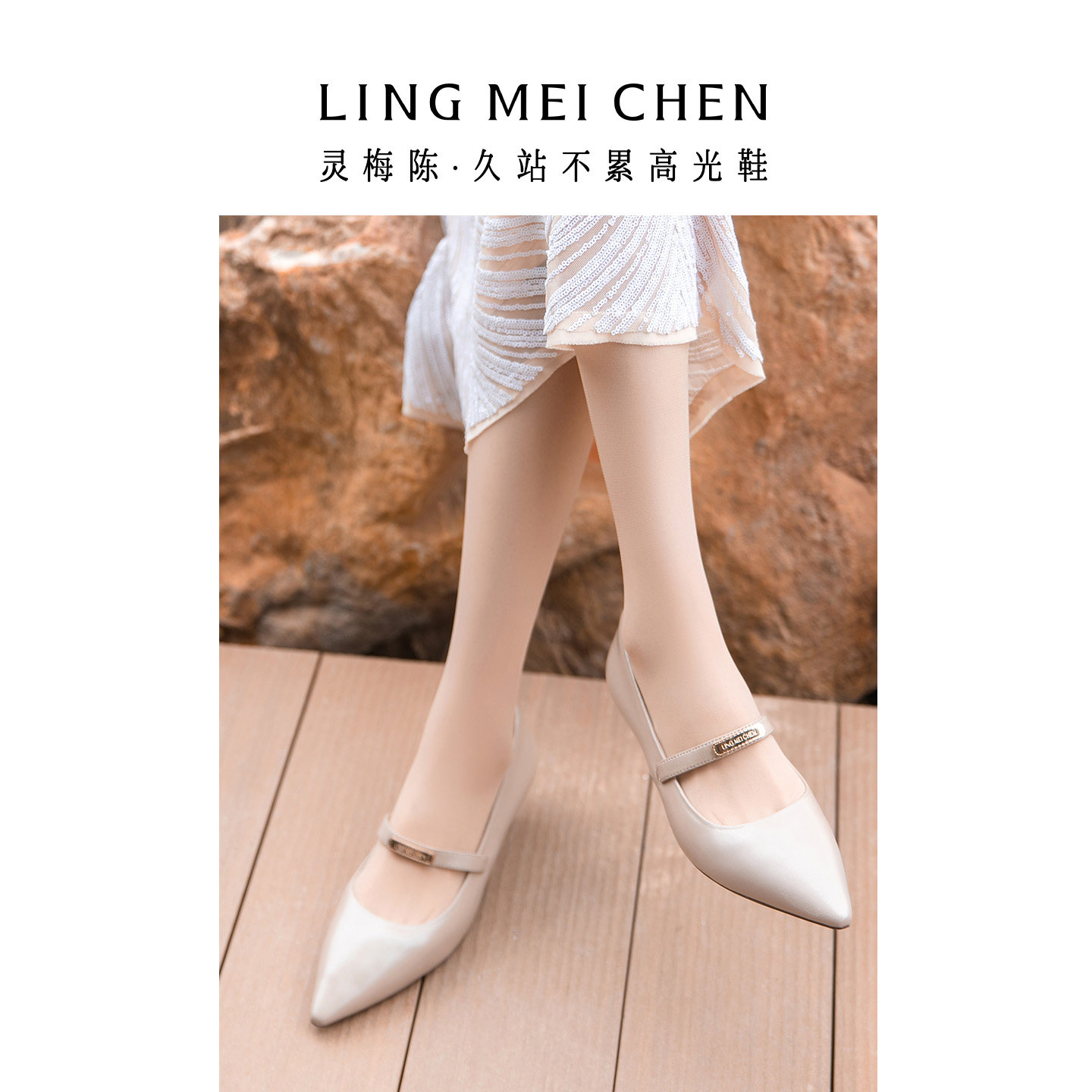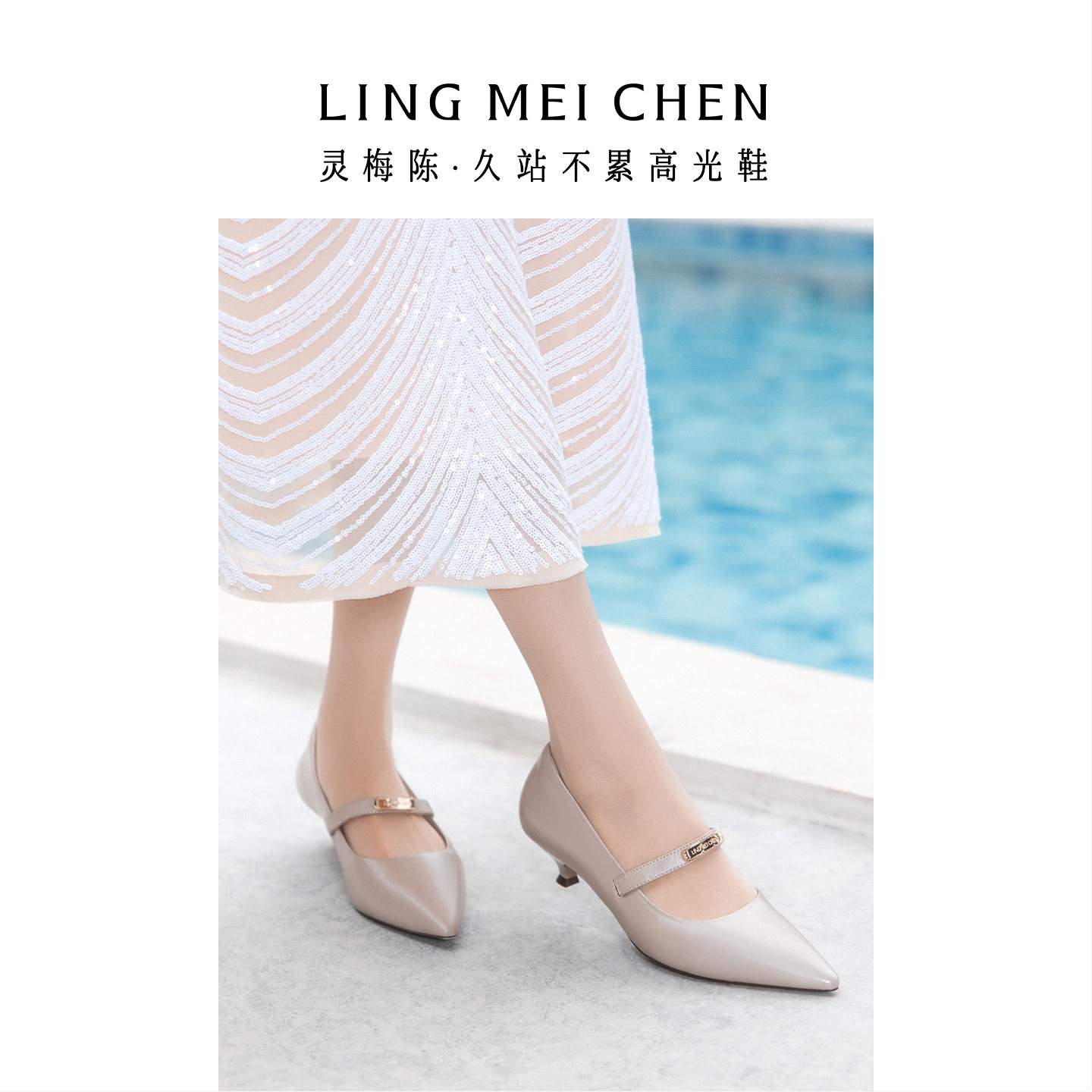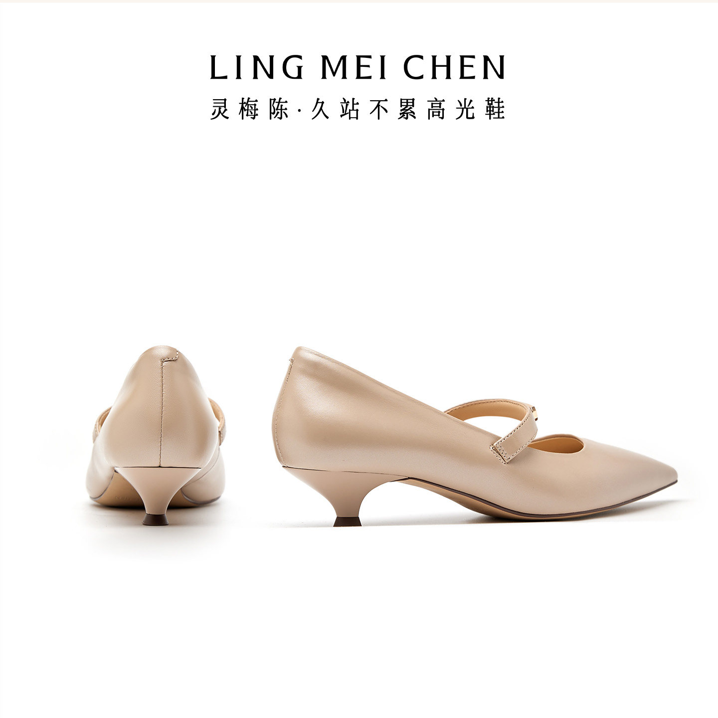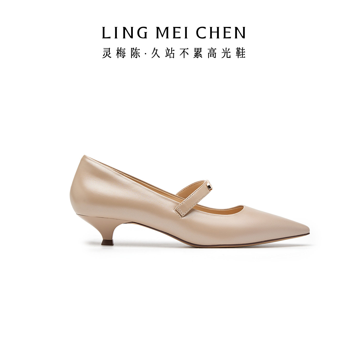 LINGMEICHEN尖头玛丽珍单鞋新款裸色羊皮女鞋气质低跟通勤高跟鞋