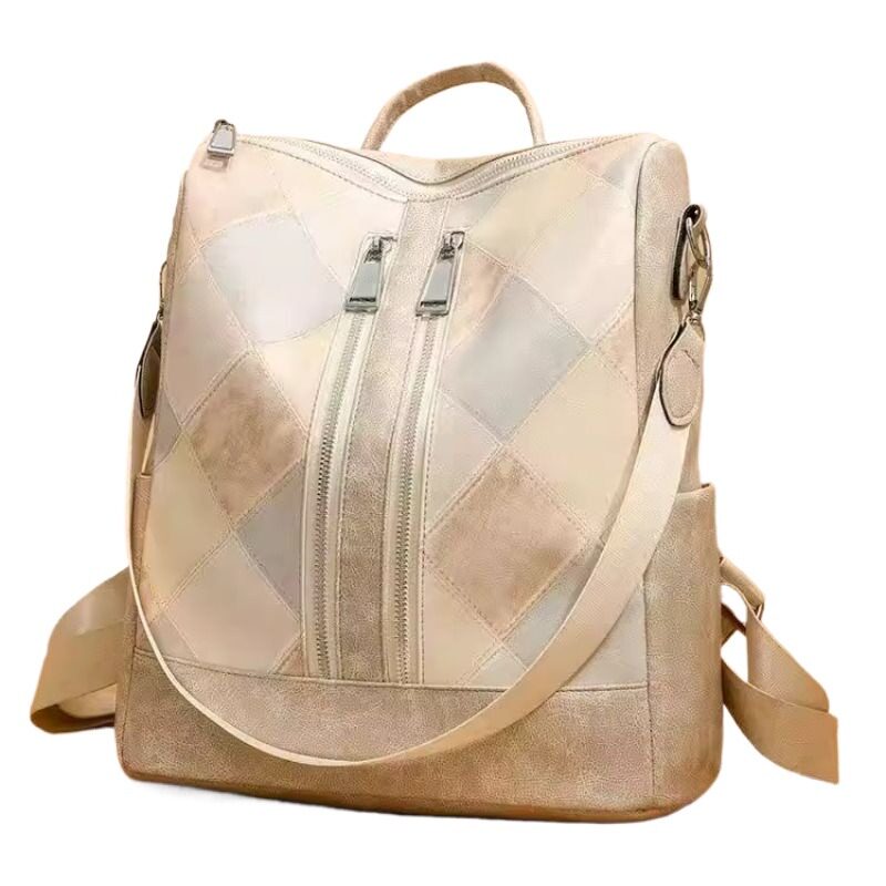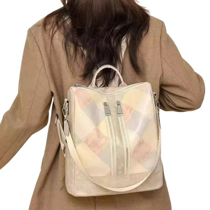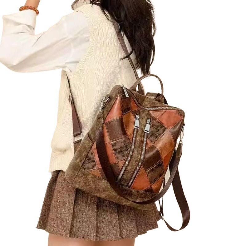 2026年双肩包女新款欧美复古女士软皮时尚拼接菱格多功能旅行