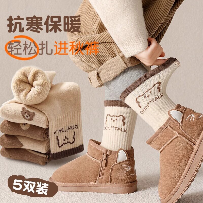 儿童袜子男童秋冬季加厚保暖中筒袜男孩加绒长袜女宝宝小熊毛圈袜