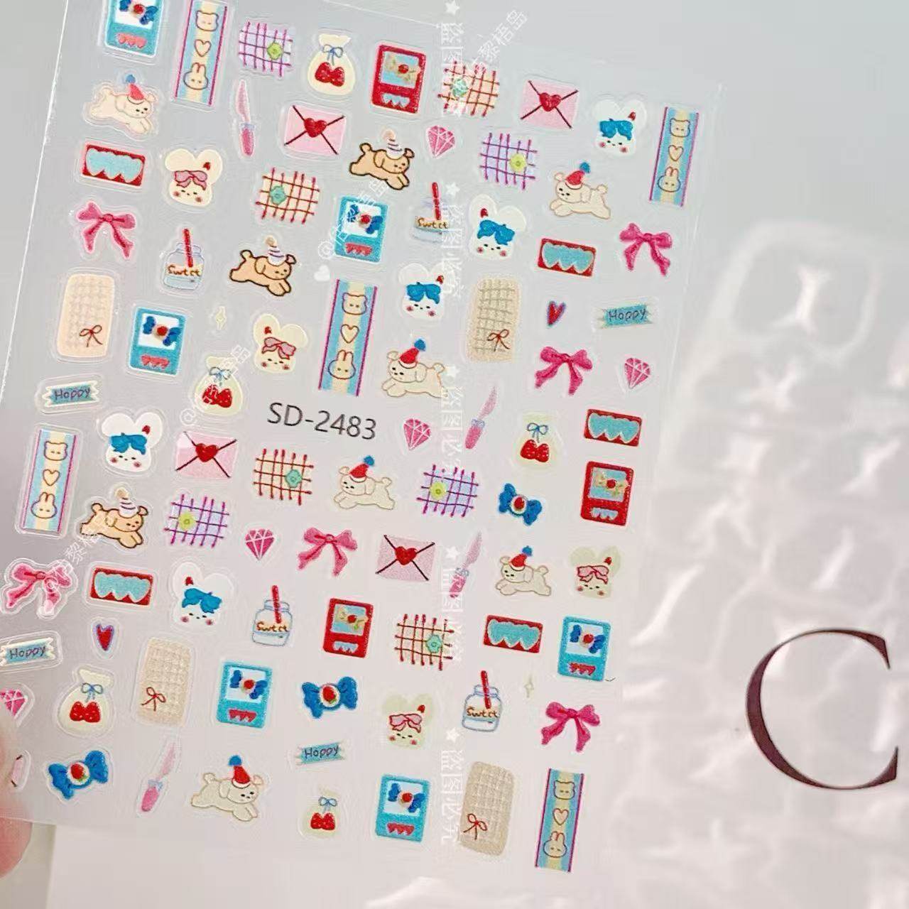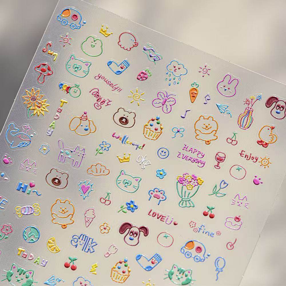 新款可爱涂鸦线条浮雕美甲贴纸小狗小兔花朵百搭多巴胺背胶指甲贴