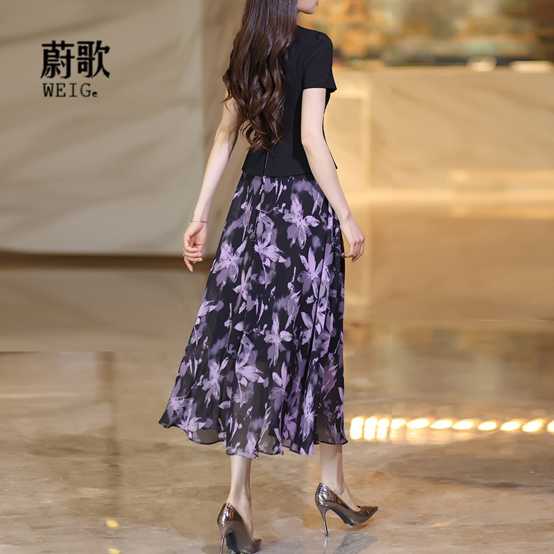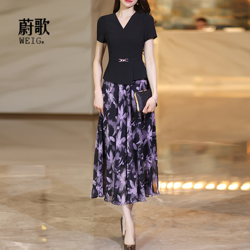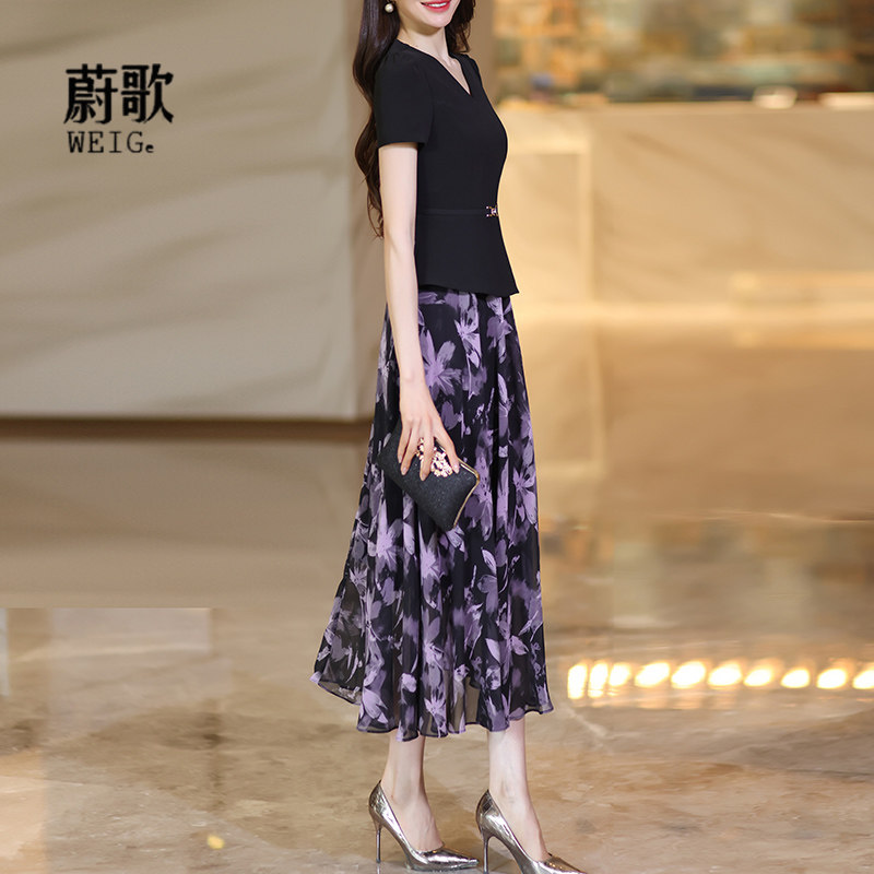 黑色假两件长款碎花连衣裙女夏2025新款气质拼接修身显瘦减龄长裙