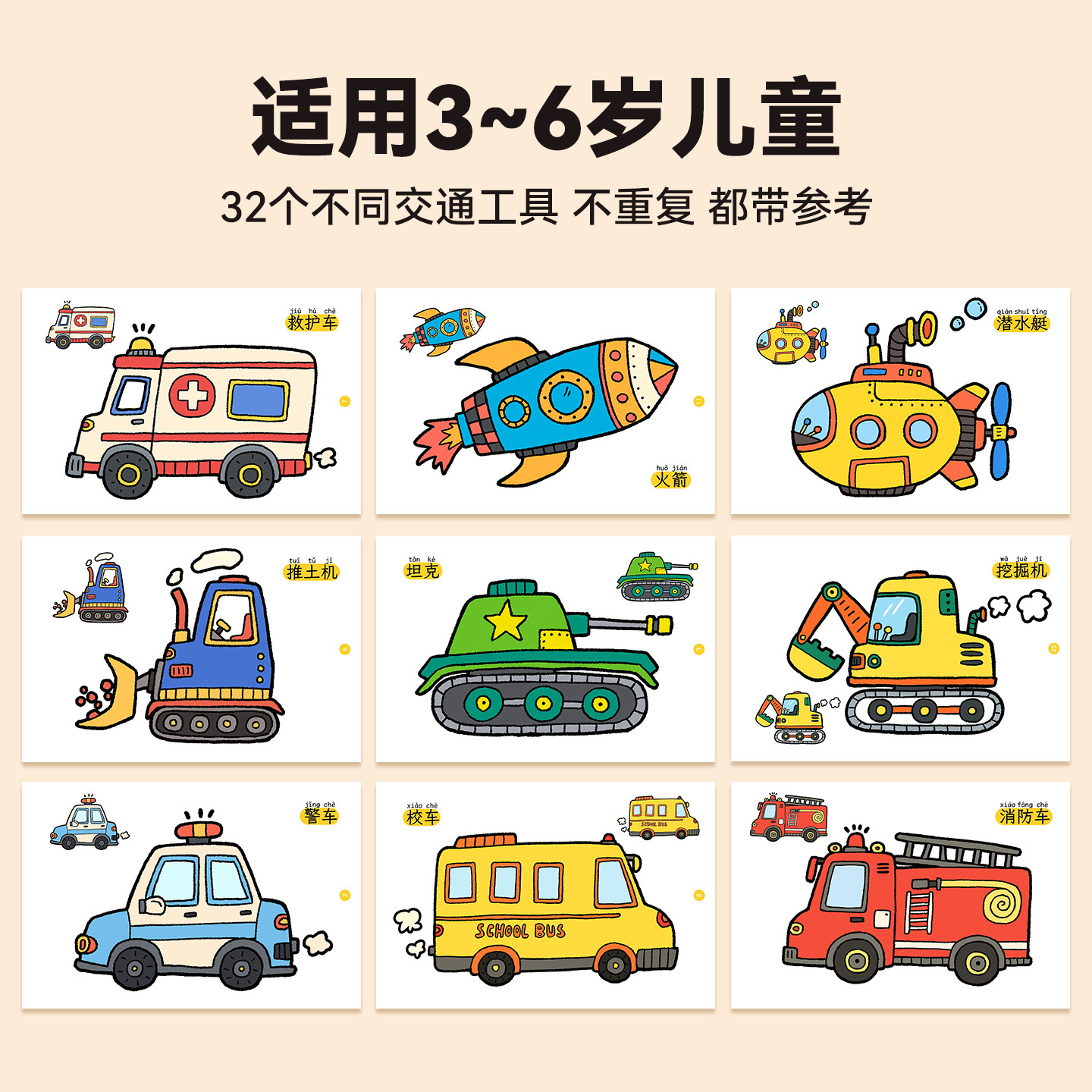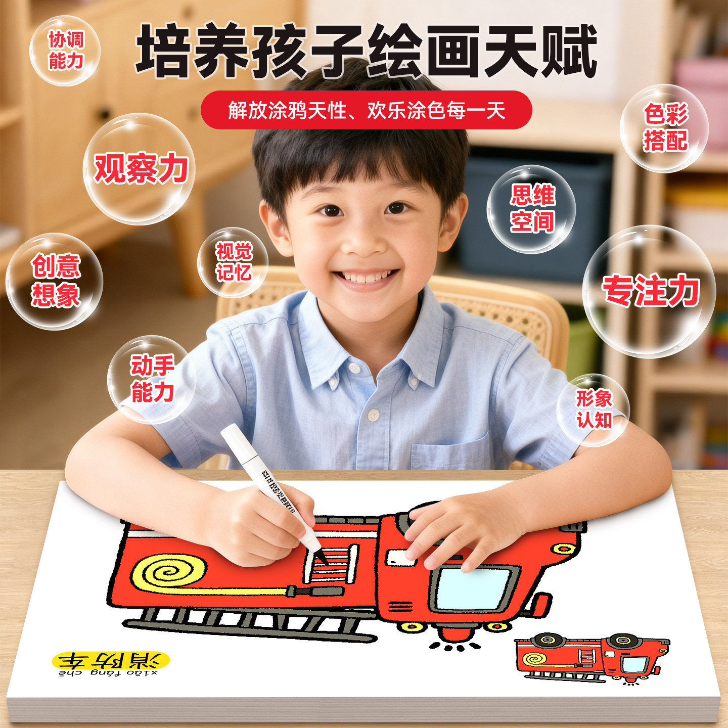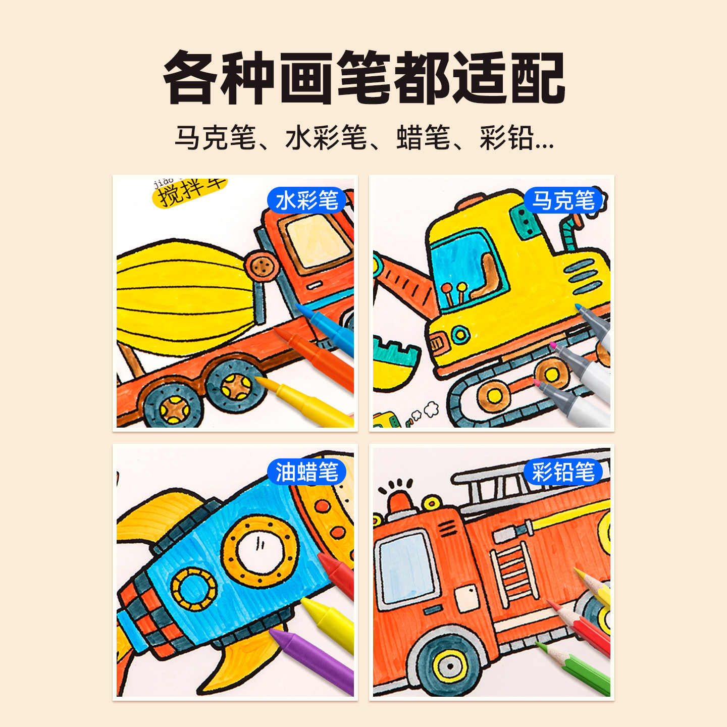 消防车儿童工程车交通工具汽车涂色画画本幼儿园涂鸦玩具马克笔