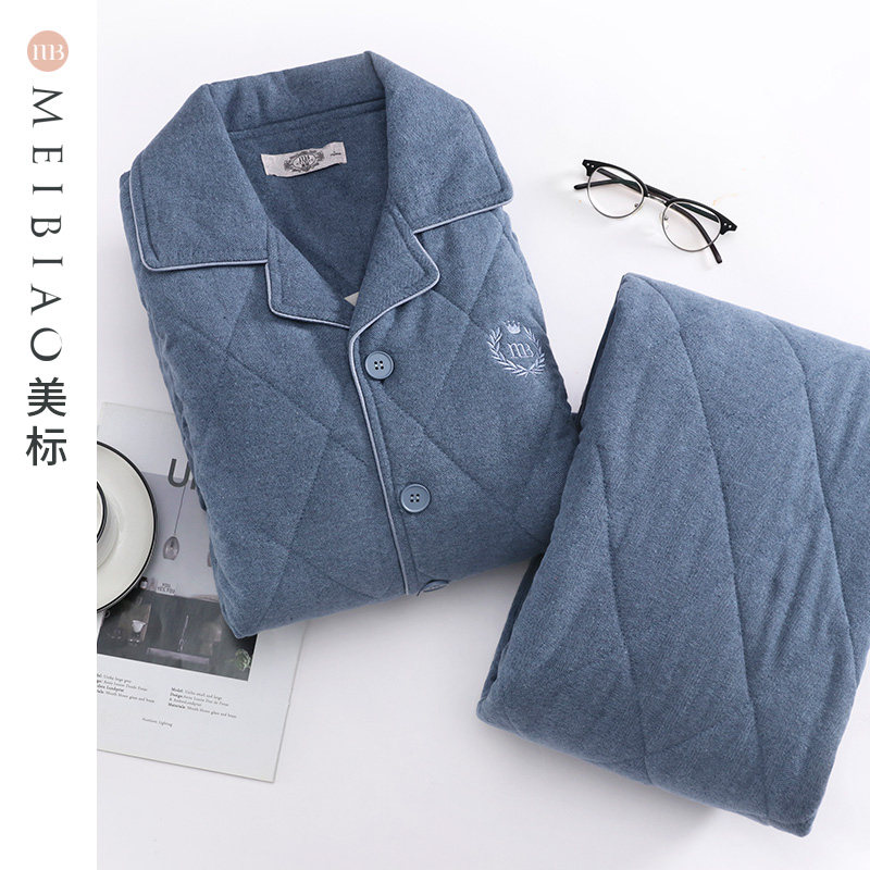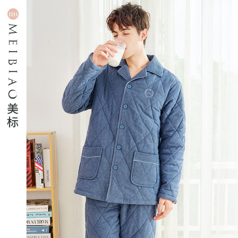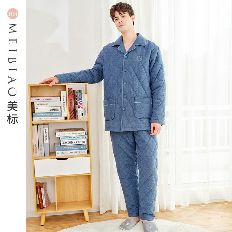 美标新款三层加厚夹棉纯棉睡衣套装男士秋冬特厚可外穿全棉家居服