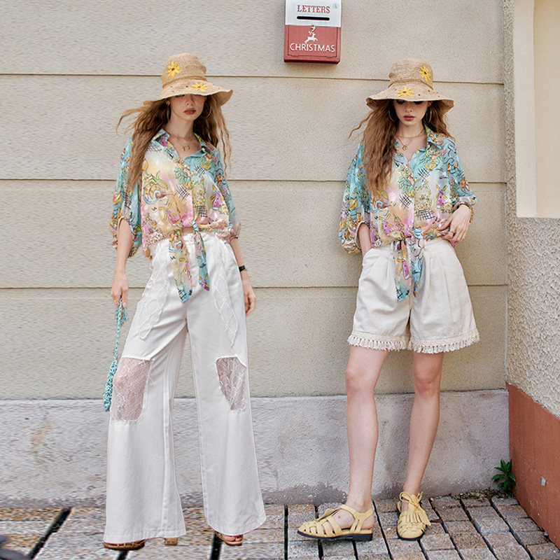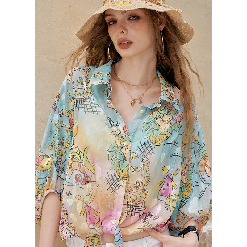 妖精的口袋趣味满印系带长袖衬衫女2025年夏季新款度假风沙滩上衣