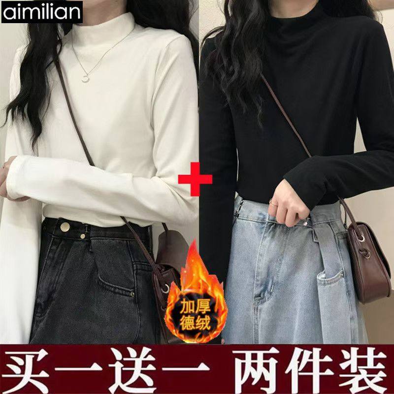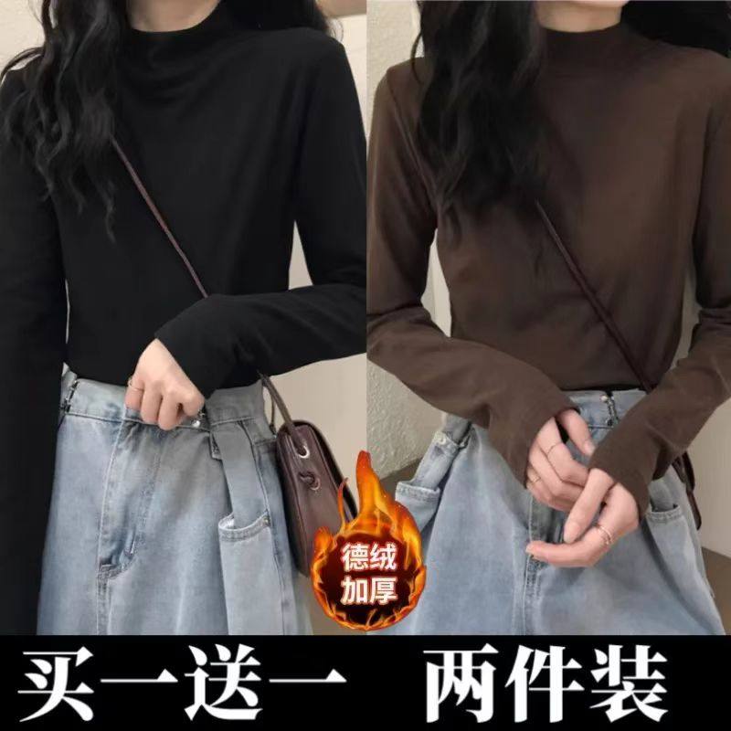 单/两件装 德绒磨毛保暖打底衫女秋冬新款半高领修身大码长袖T恤E