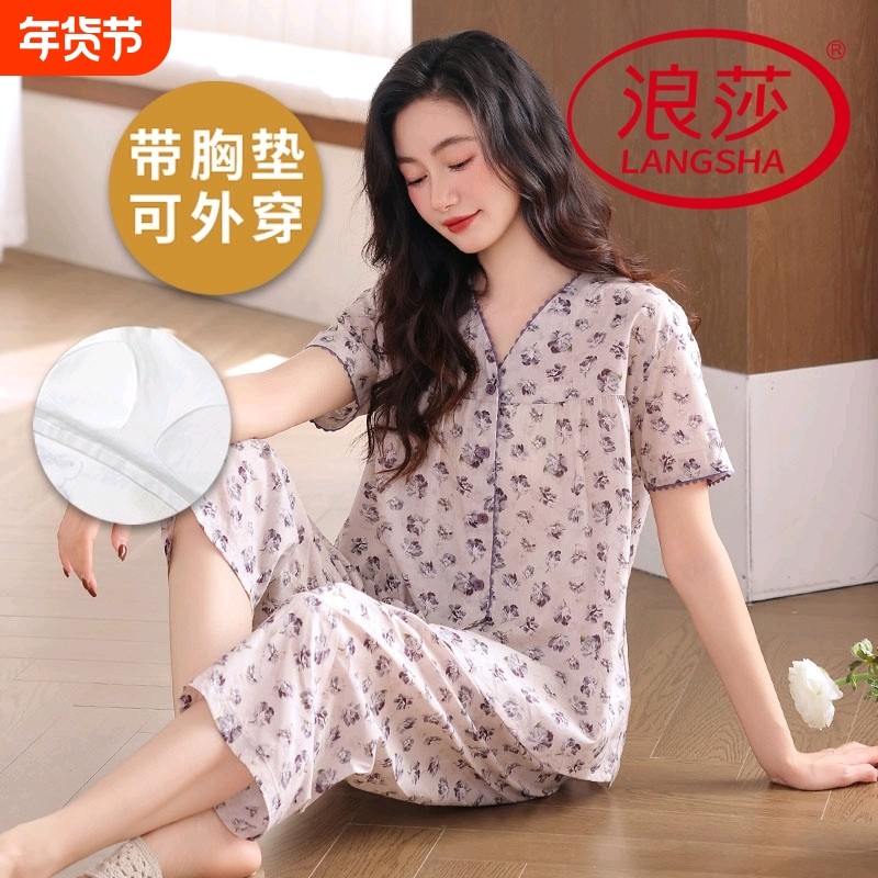 浪莎纯棉带胸垫家居服睡衣女夏季短袖七分裤薄款韩式可外穿两件套
