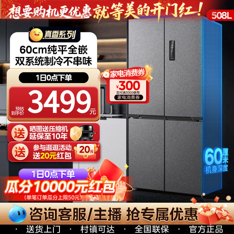 【新品】美的508超薄零嵌入冰箱十字双开四门大容量家用风冷无霜