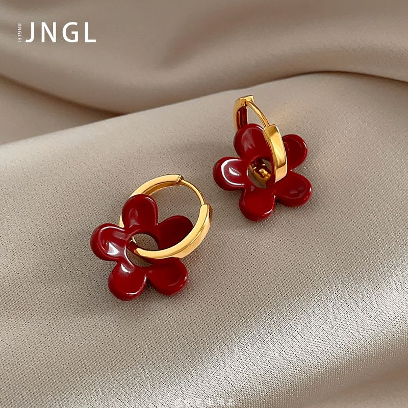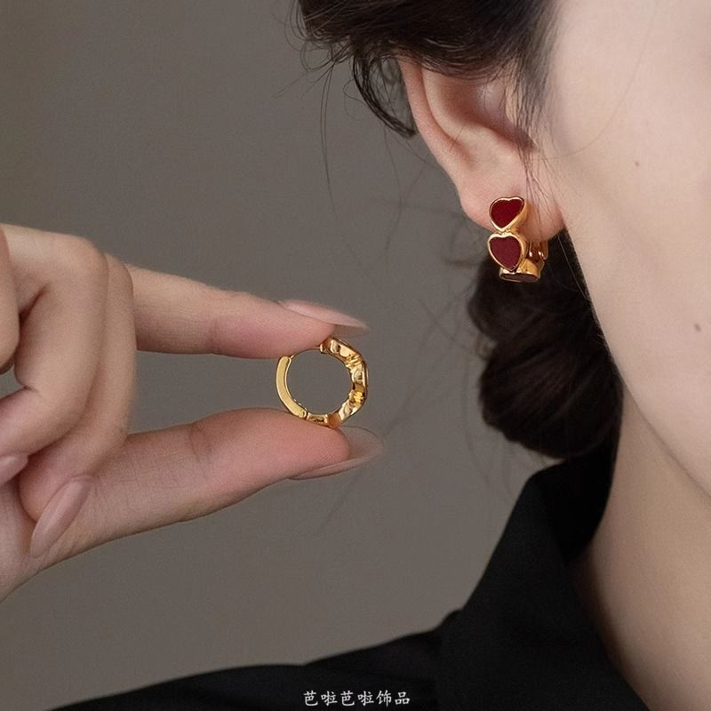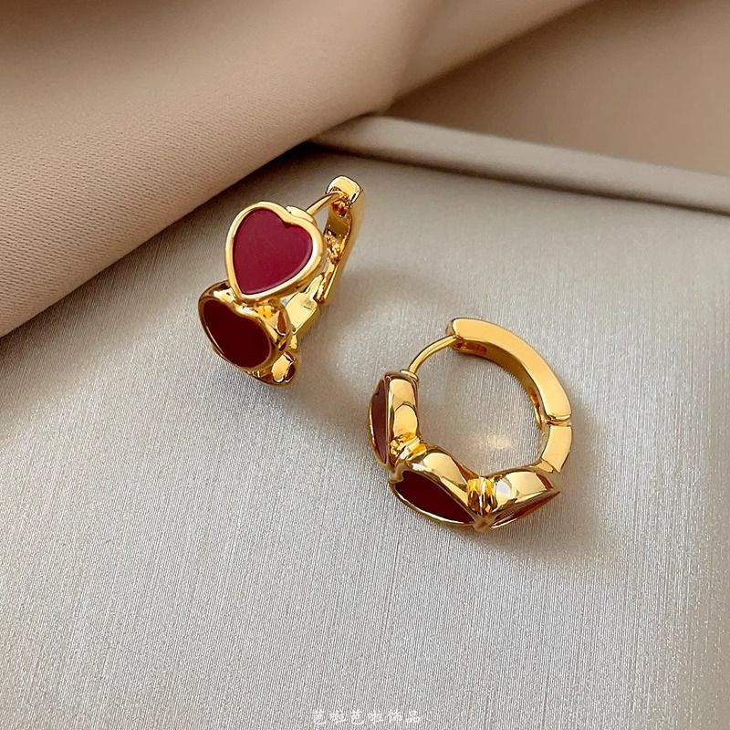 复古新年酒红色滴釉爱心耳环女气质高级感百搭耳钉时尚个性耳饰品