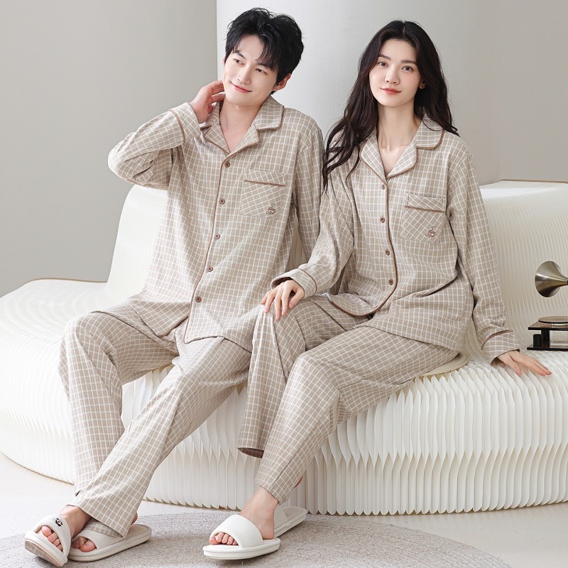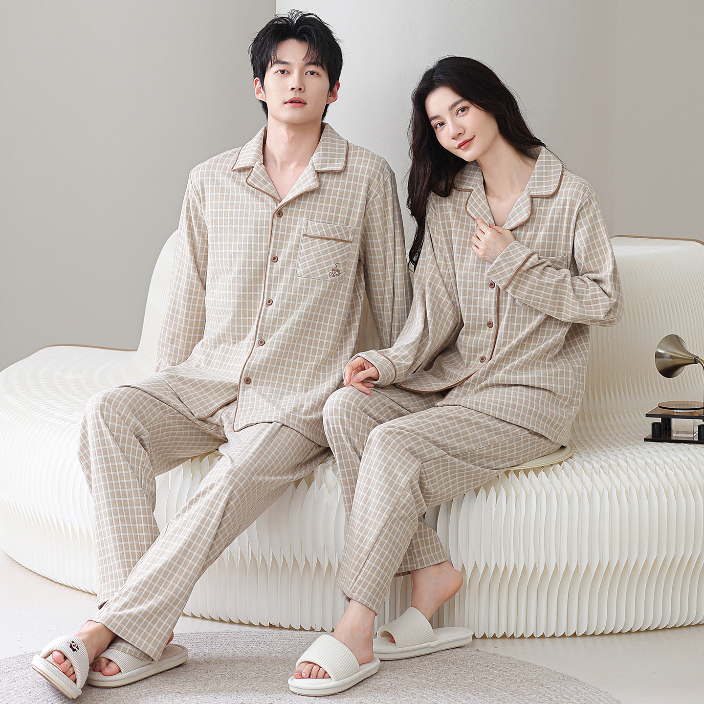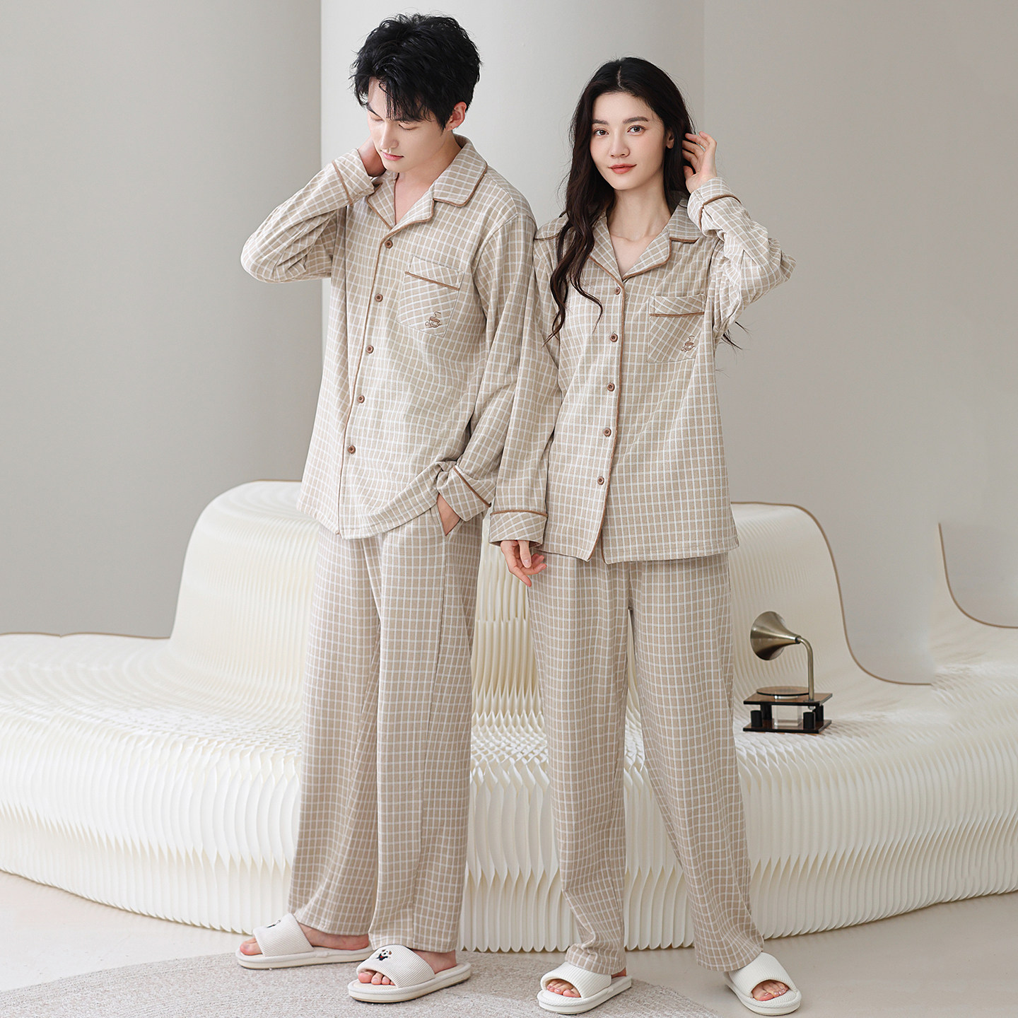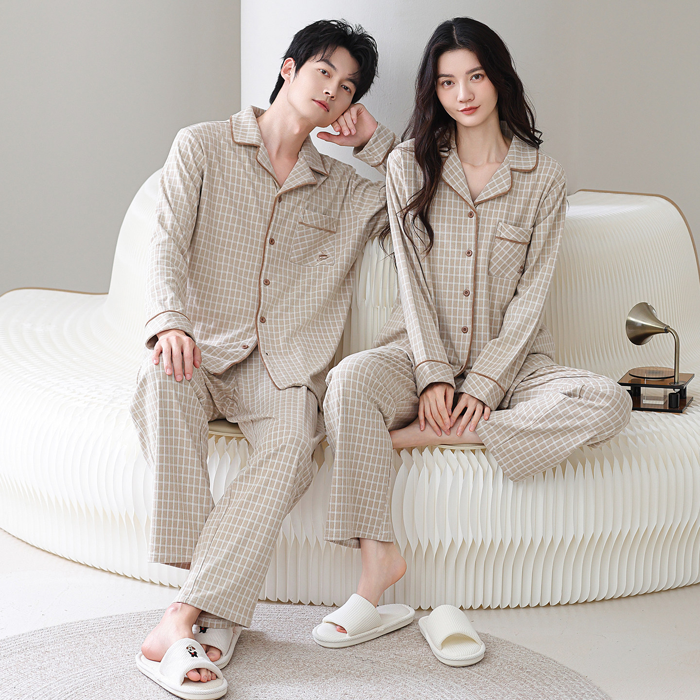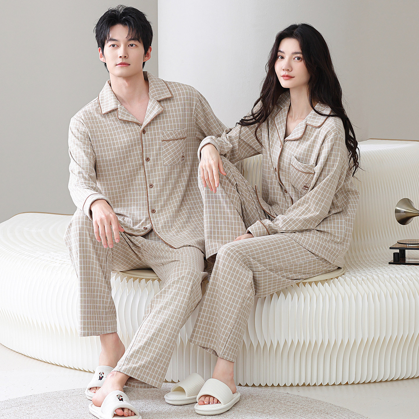 安比斯情侣睡衣舒适纯棉秋季女长袖男女同款休闲家居服套装可出门