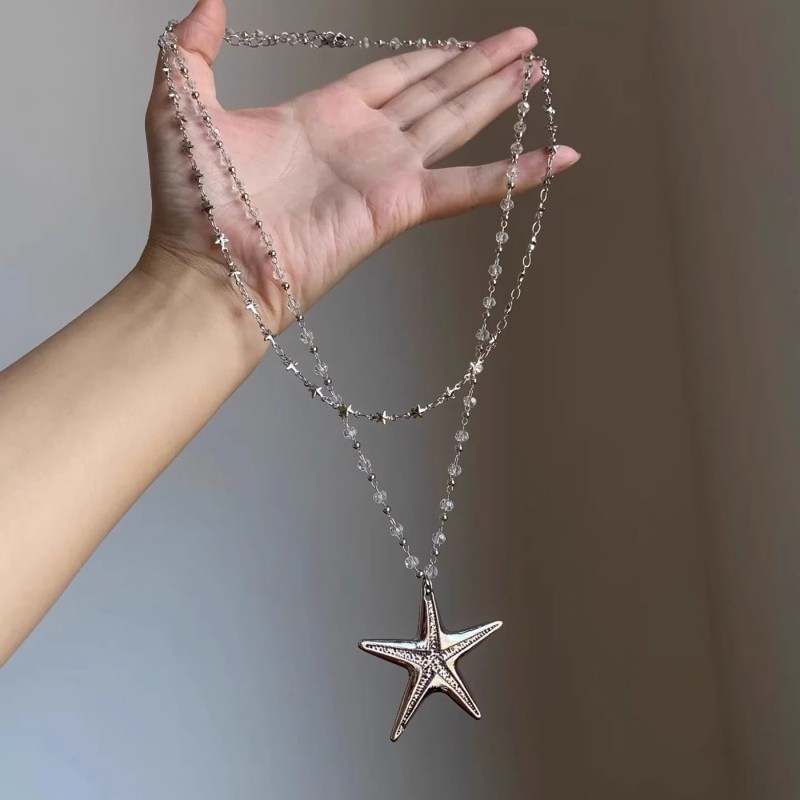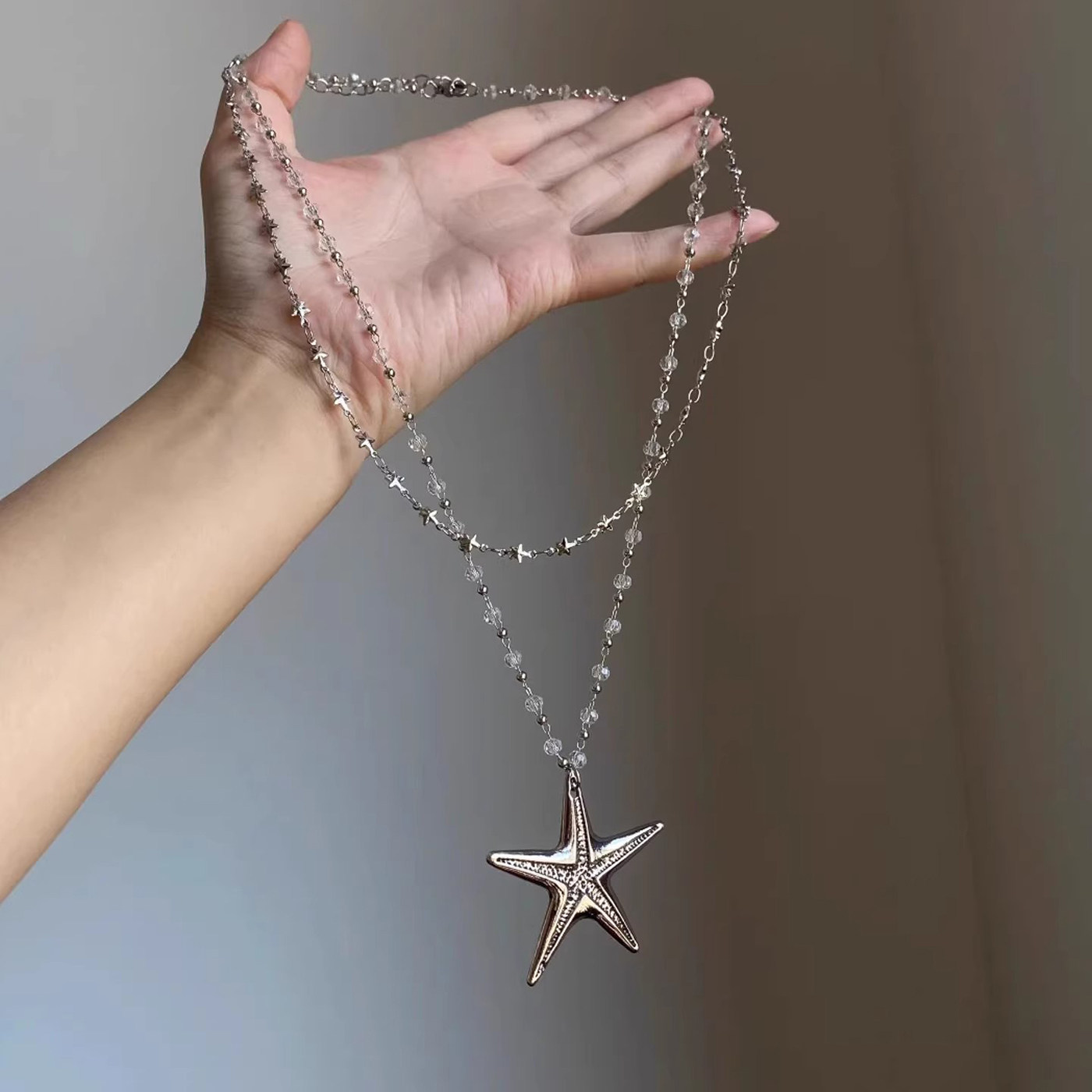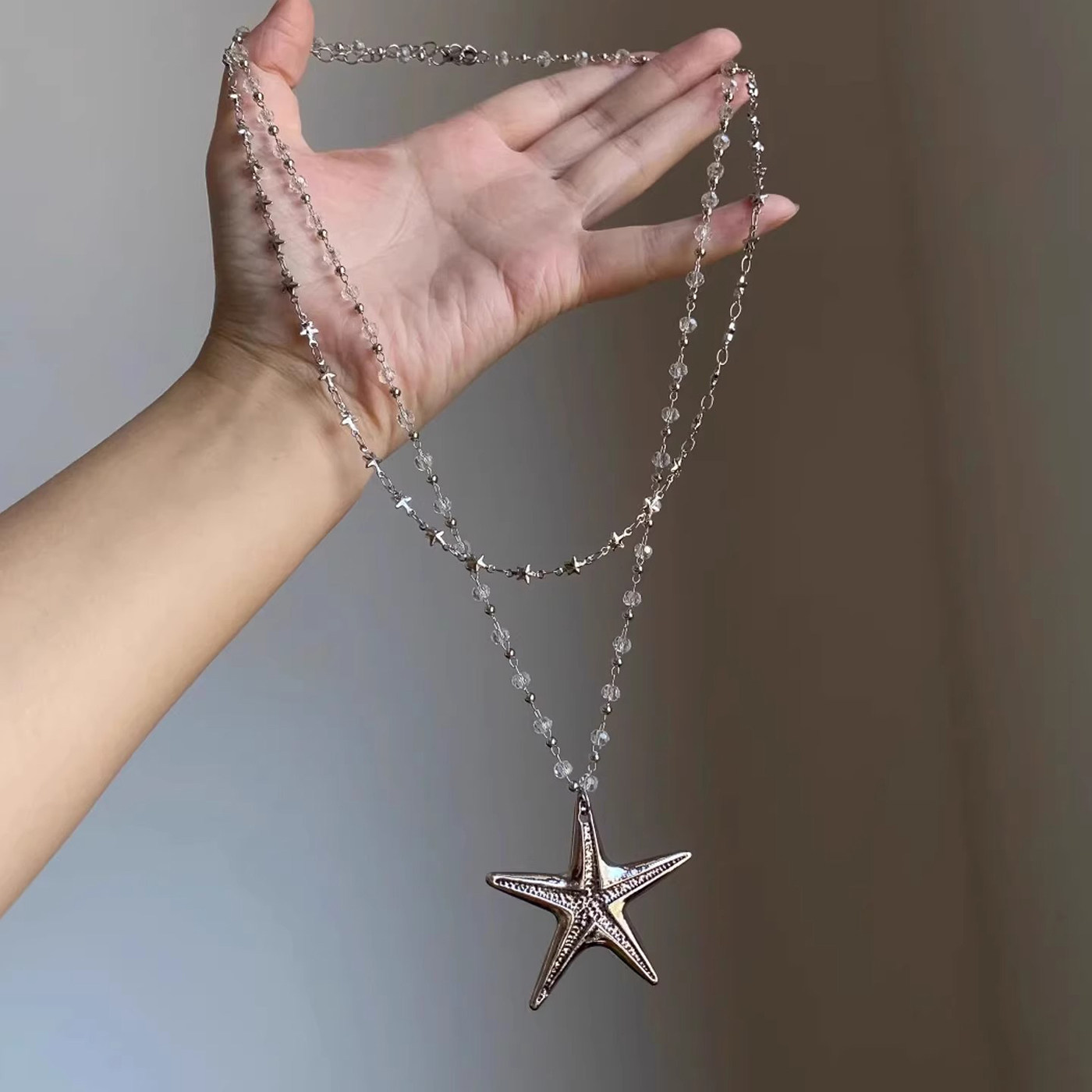 甜酷风双层叠戴银色海星吊坠项链长毛衣链颈链千禧辣妹风配饰女