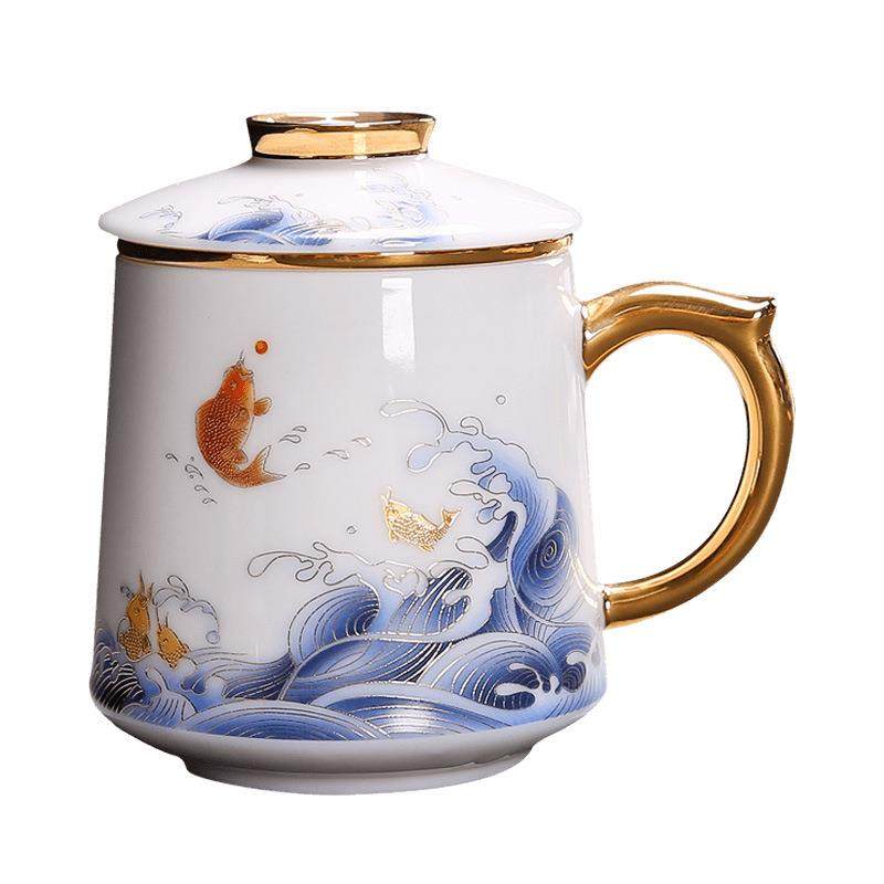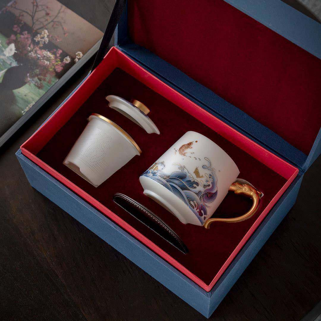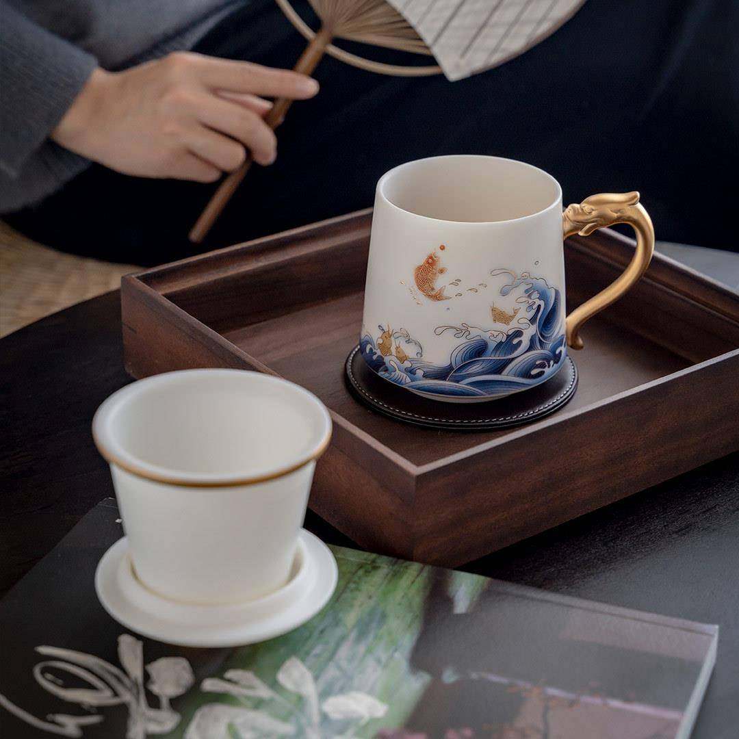 哲选鱼跃龙门茶水分离泡茶杯贴花德化羊脂玉瓷茶漏送礼