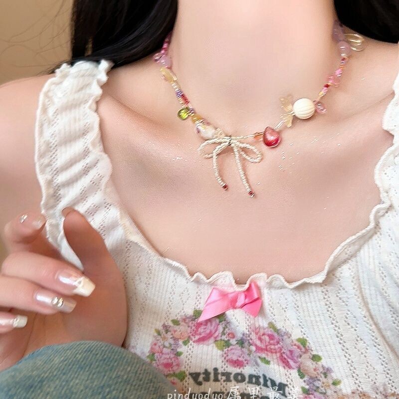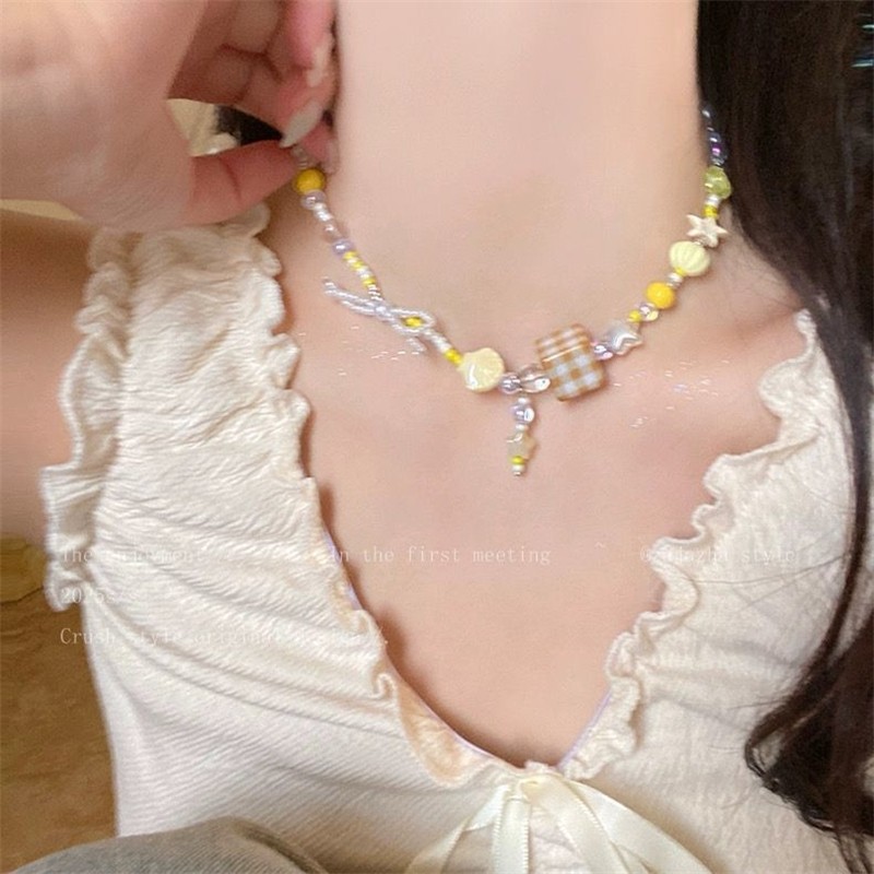 黄色蝴蝶结星星锁骨链女可爱童趣串珠项链度假拍照氛围感颈链配饰