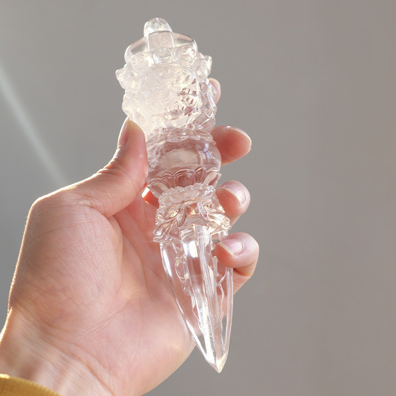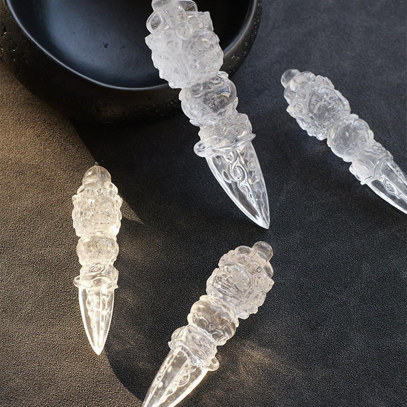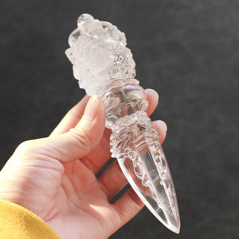 天然白水晶金刚杵摆件手工雕刻手把件供奉修行普巴金刚橛降魔杵