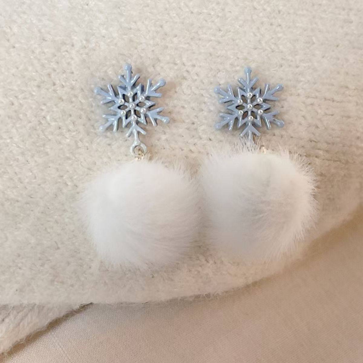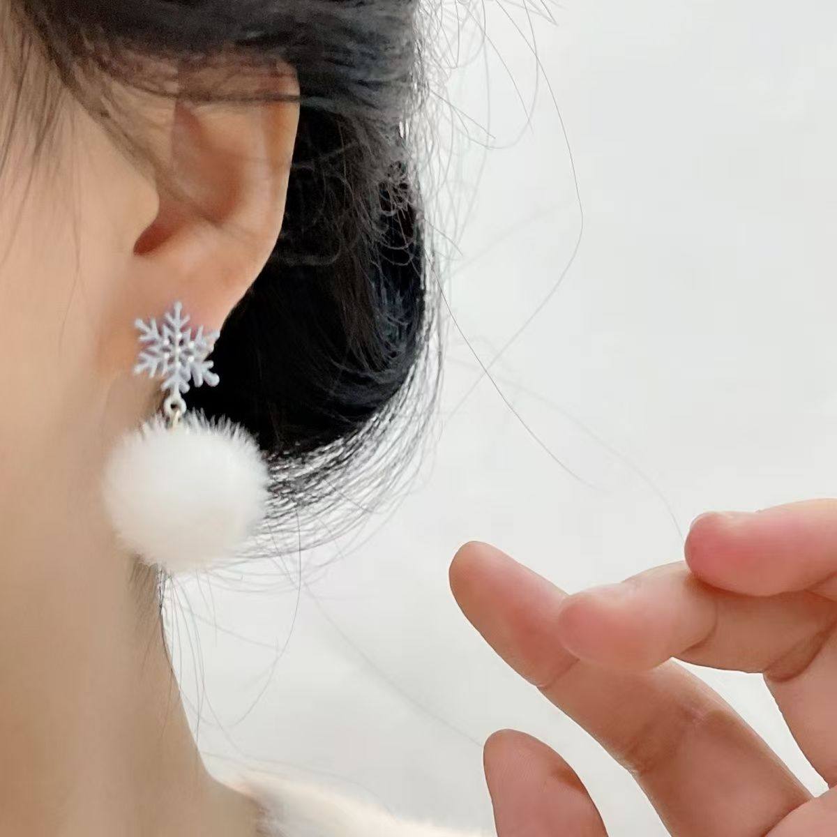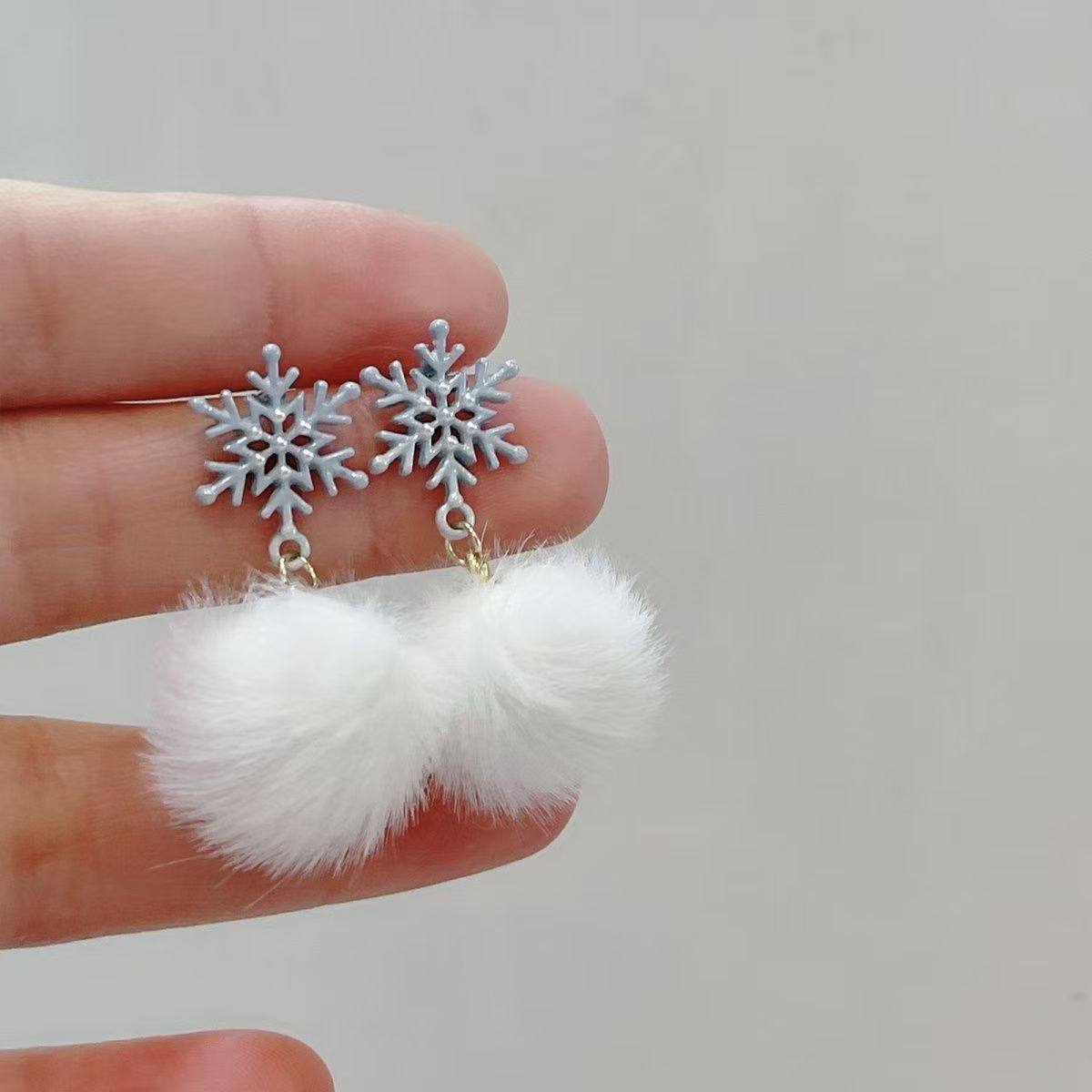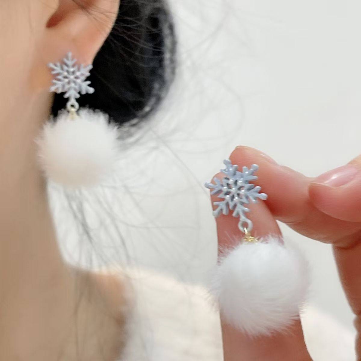 可爱麋鹿超仙甜美氛围感2025秋冬季新款雪花毛绒球小清新耳钉简约