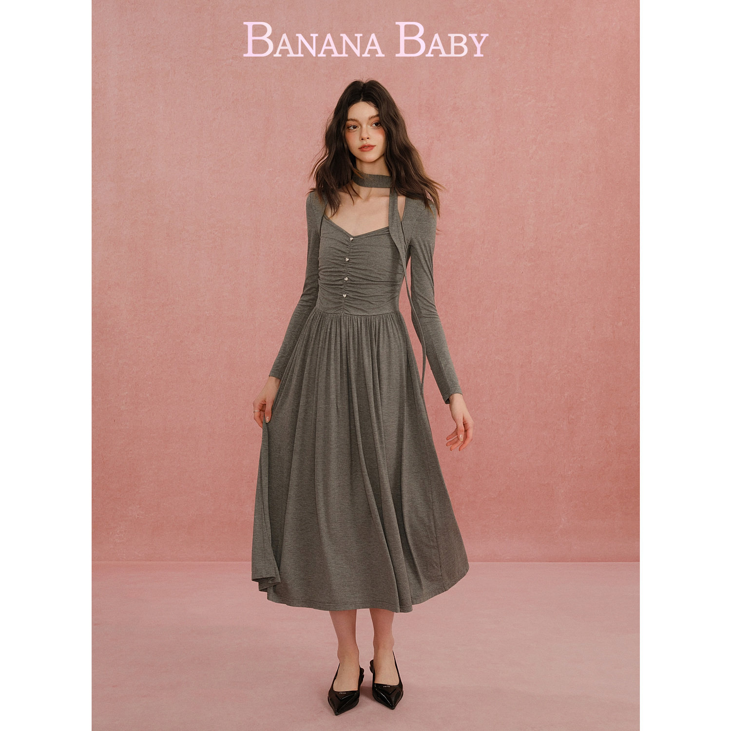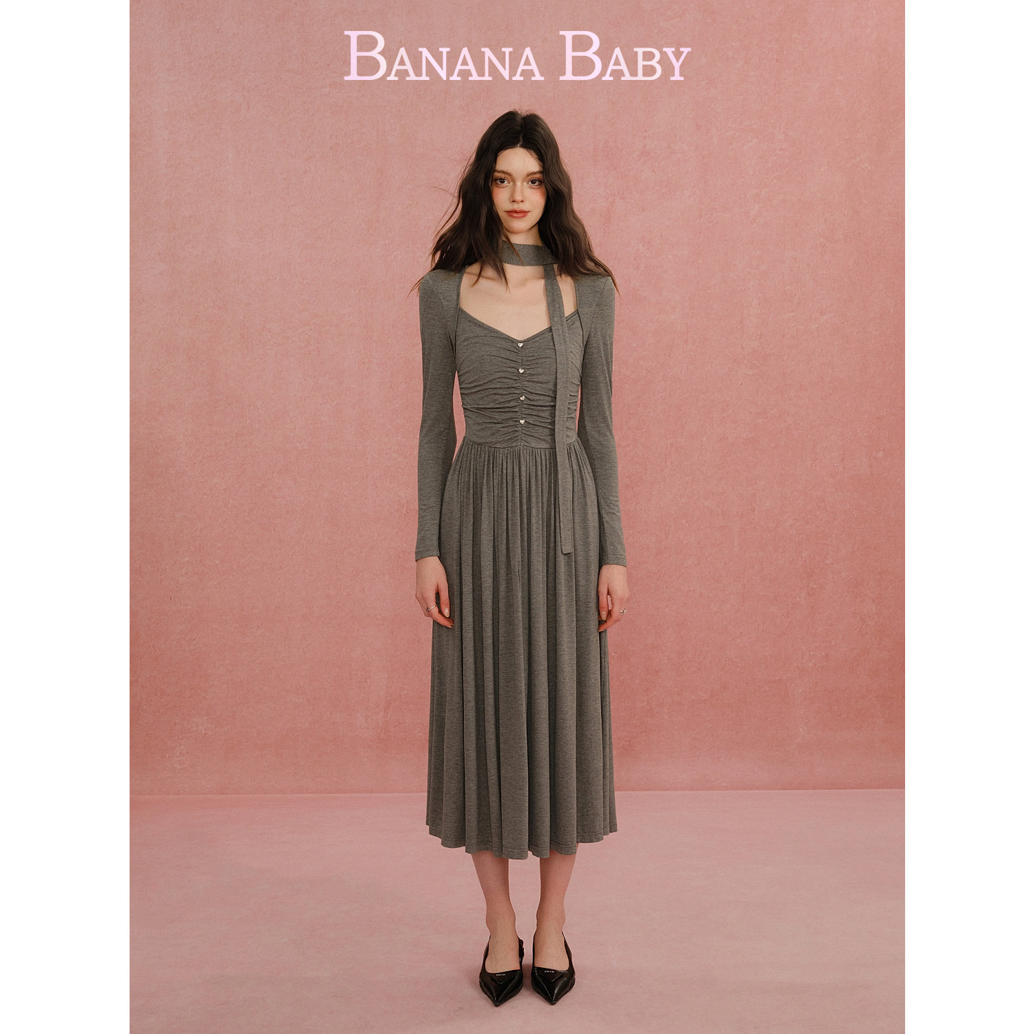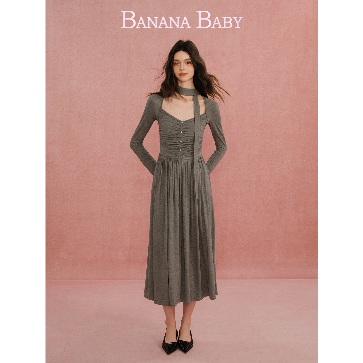 新品-BANANA BABY2026年春新款格雷系弹力针织连衣裙女显瘦中长裙