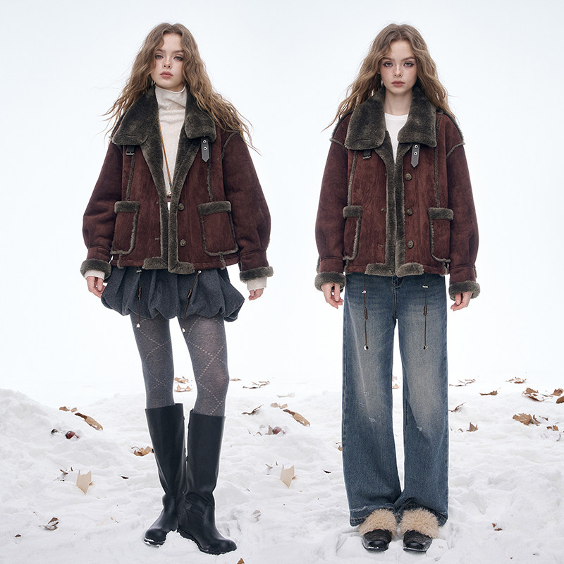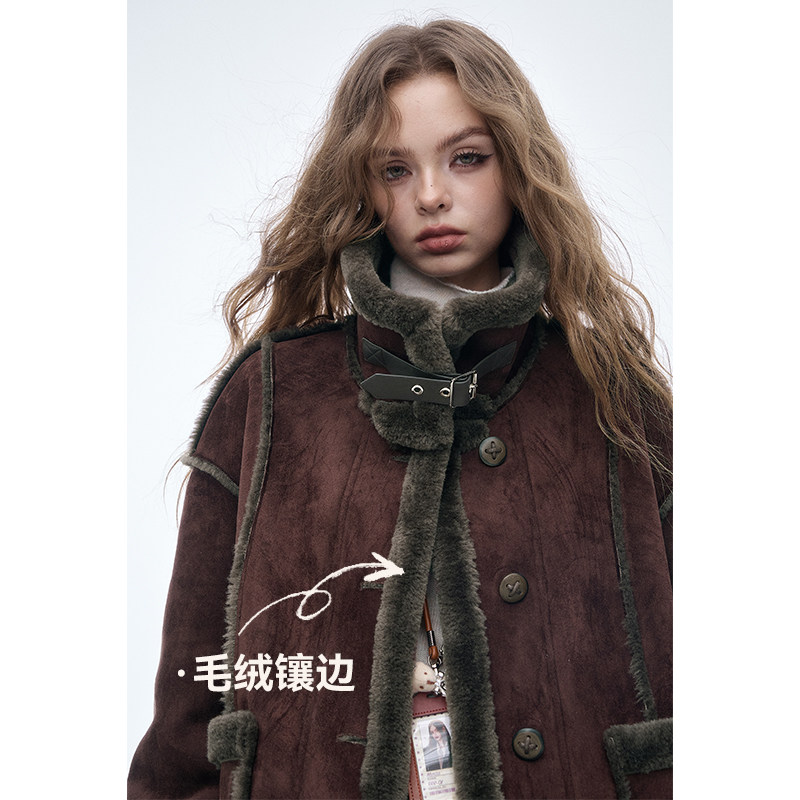 妖精的口袋复古仿麂皮毛绒绒短款毛呢外套女2025冬季新款圣诞新年