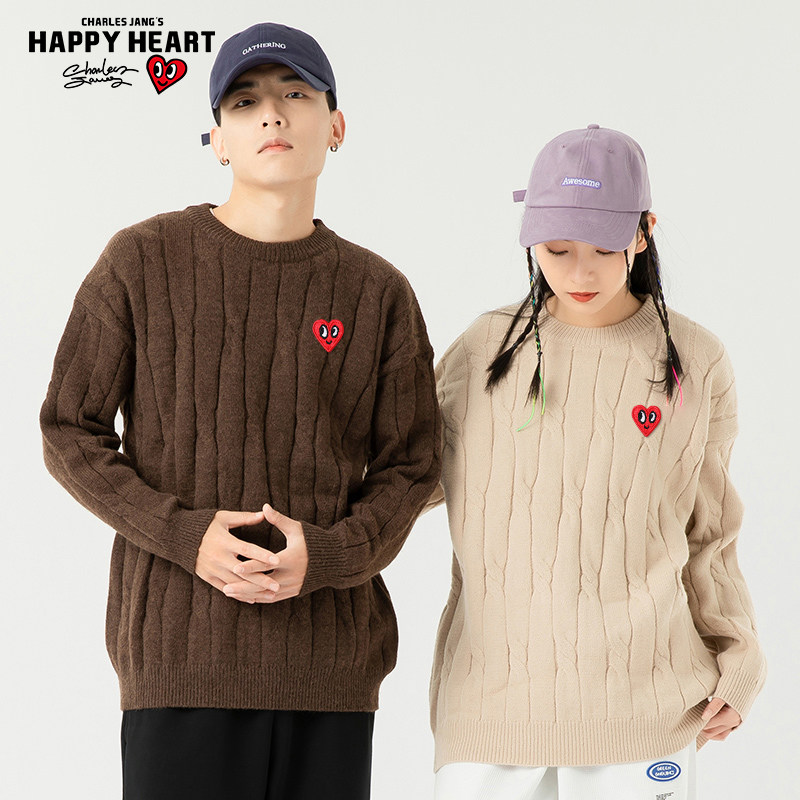 查尔斯桃心 慵懒风麻花圆领毛衣男2025新款秋冬季套头打底针织衫