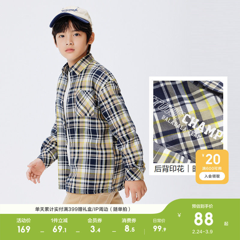 巴拉巴拉童装男童衬衫儿童长袖加绒中格子衬衣上衣红色拜年服喜庆