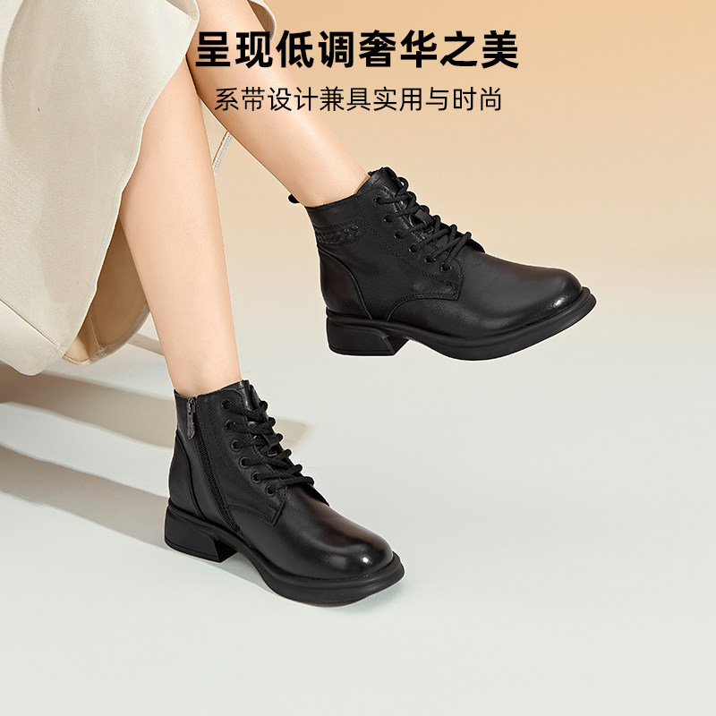 天美意粗跟厚底增高加绒英伦马丁靴女鞋子休闲短靴皮靴2025冬新款
