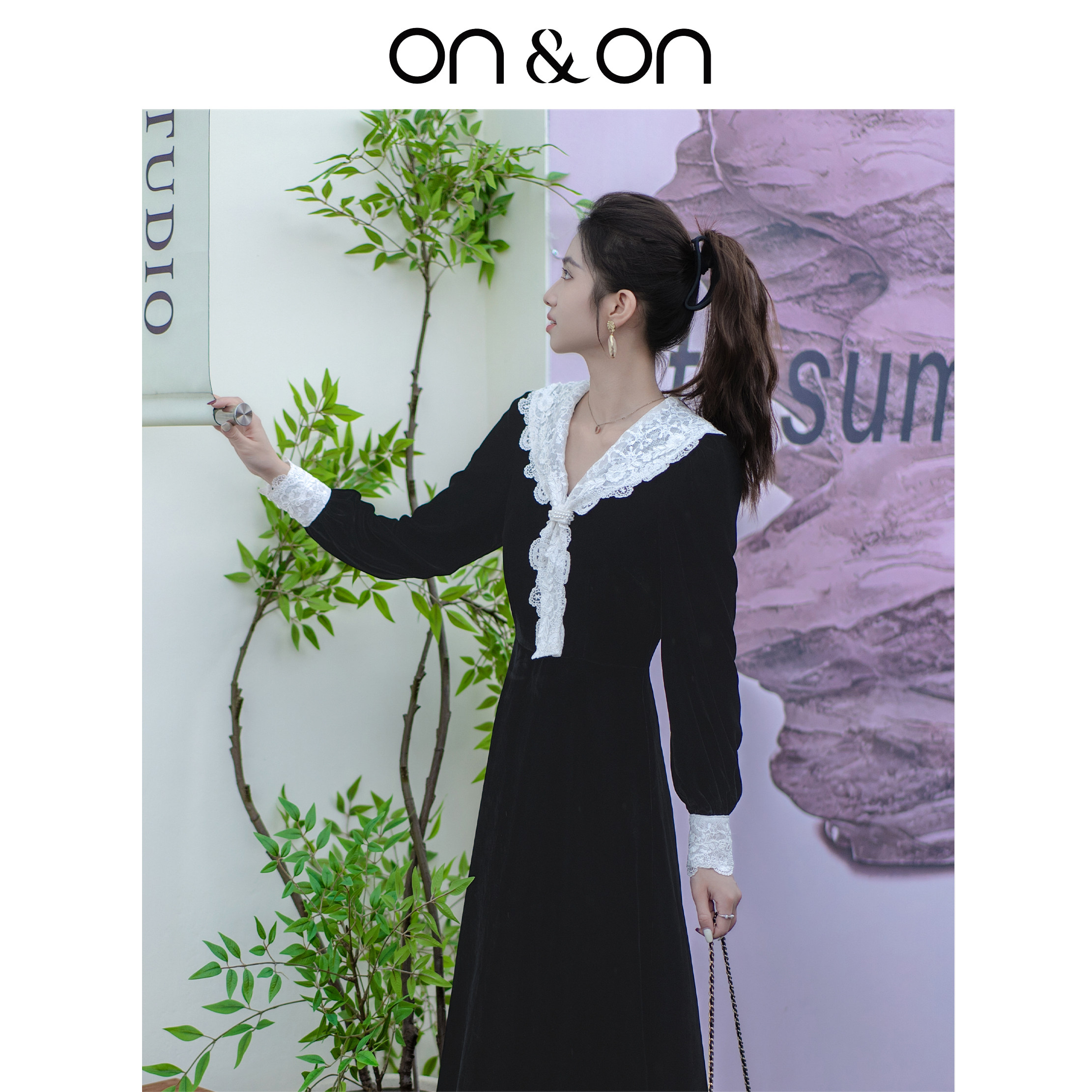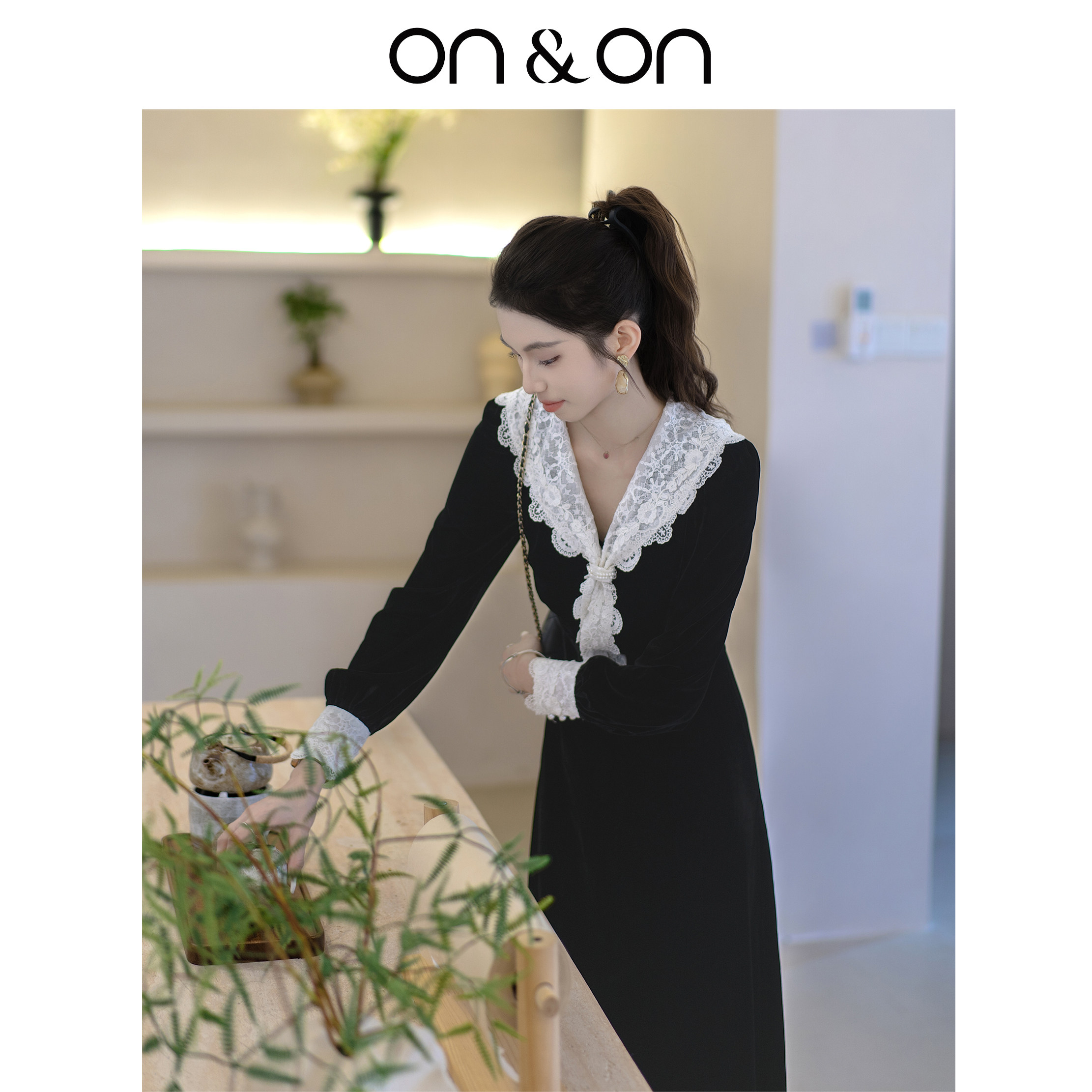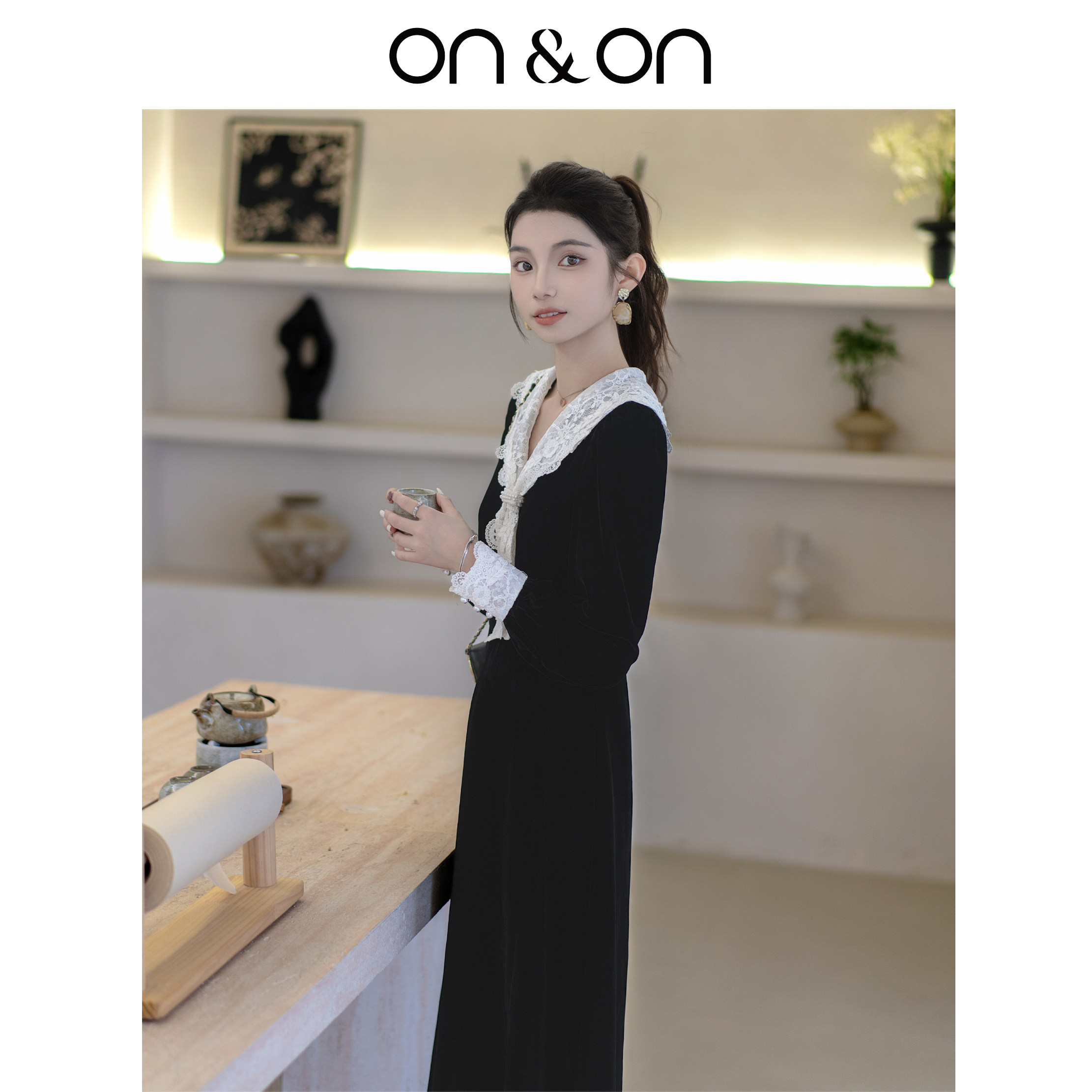 ON&ON/安乃安2025冬季法式V领蕾丝经典丝绒轻奢高级感连衣裙女
