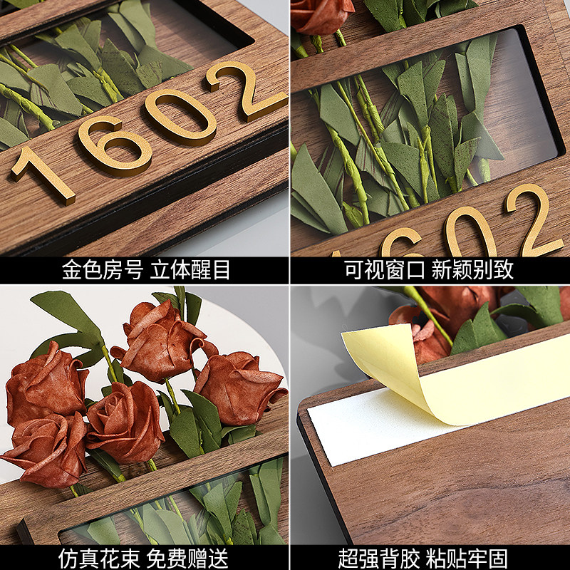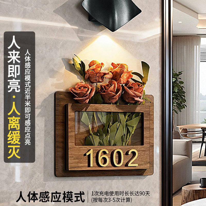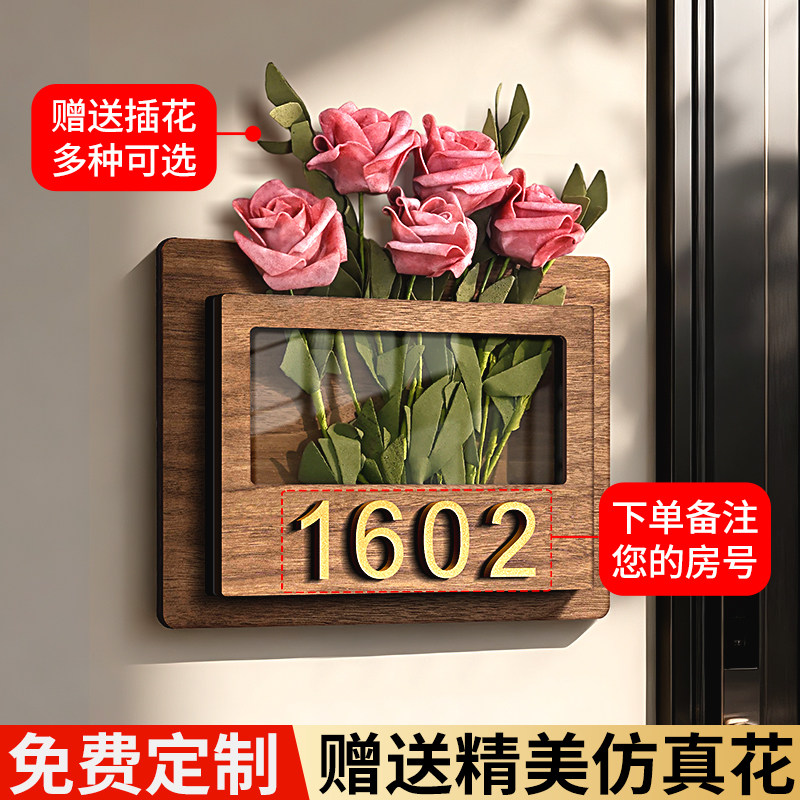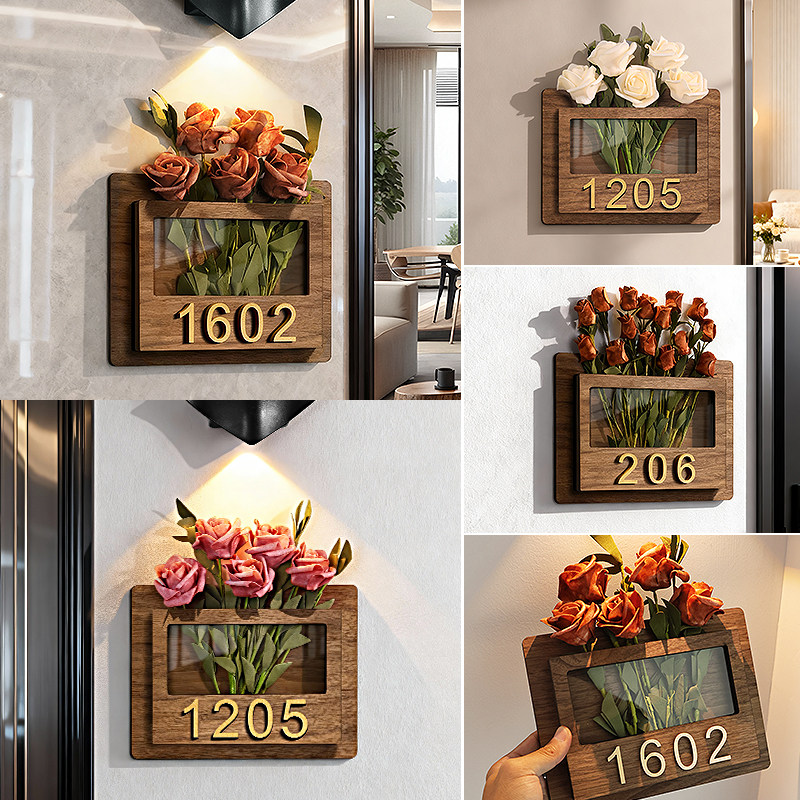 入户门牌号高级感轻奢创意号码牌家用定制进门墙面装饰品插花仿真花房号发光门外布置卧室门温馨装饰门挂墙贴