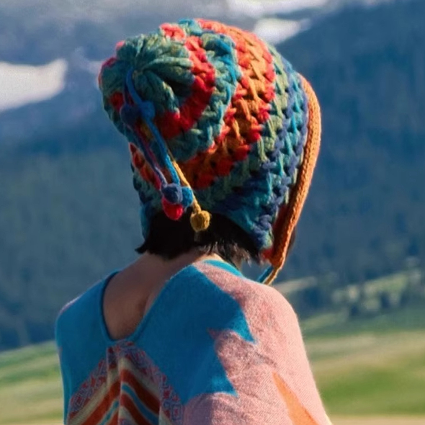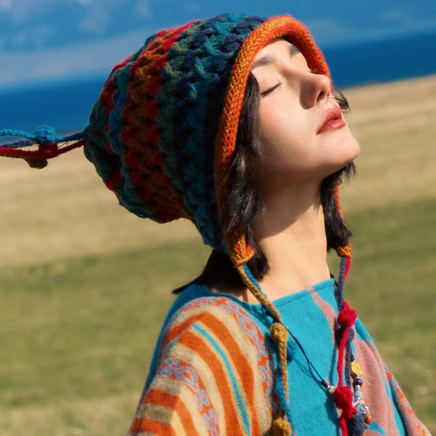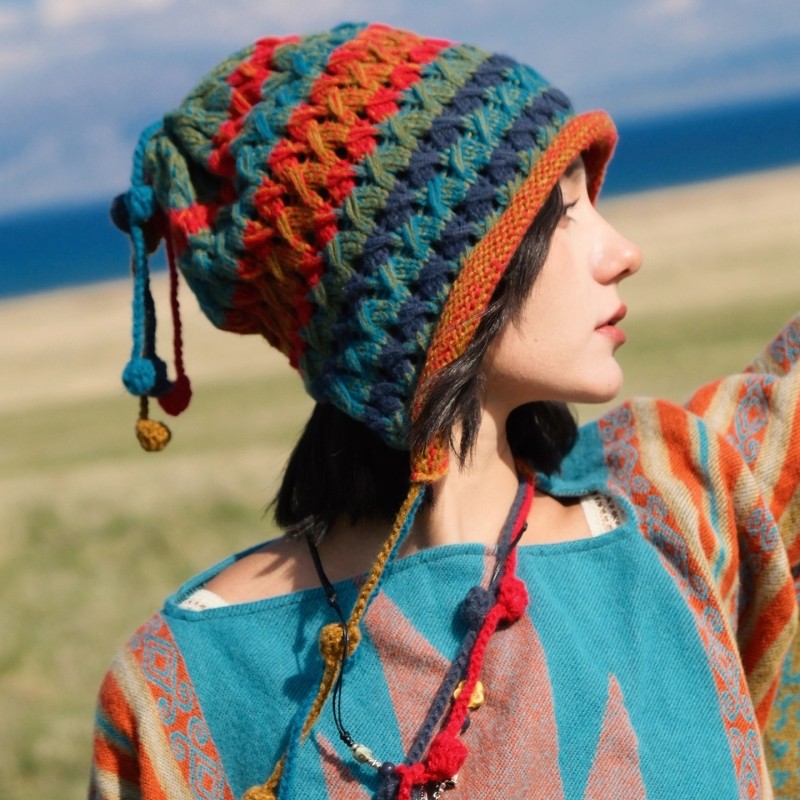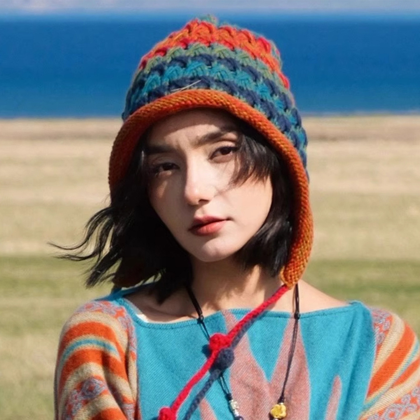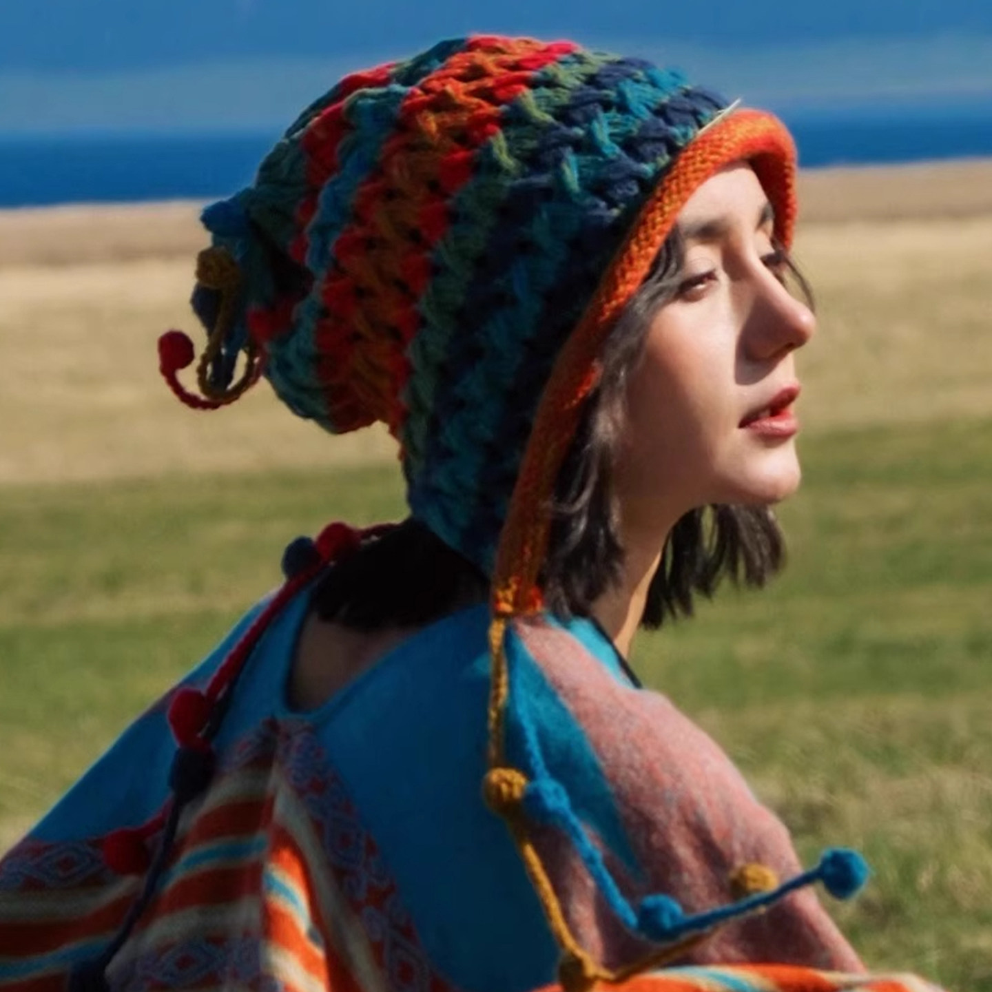 春秋季川西旅游民族风流苏针织套头帽子女款出游拍照显脸小毛线帽