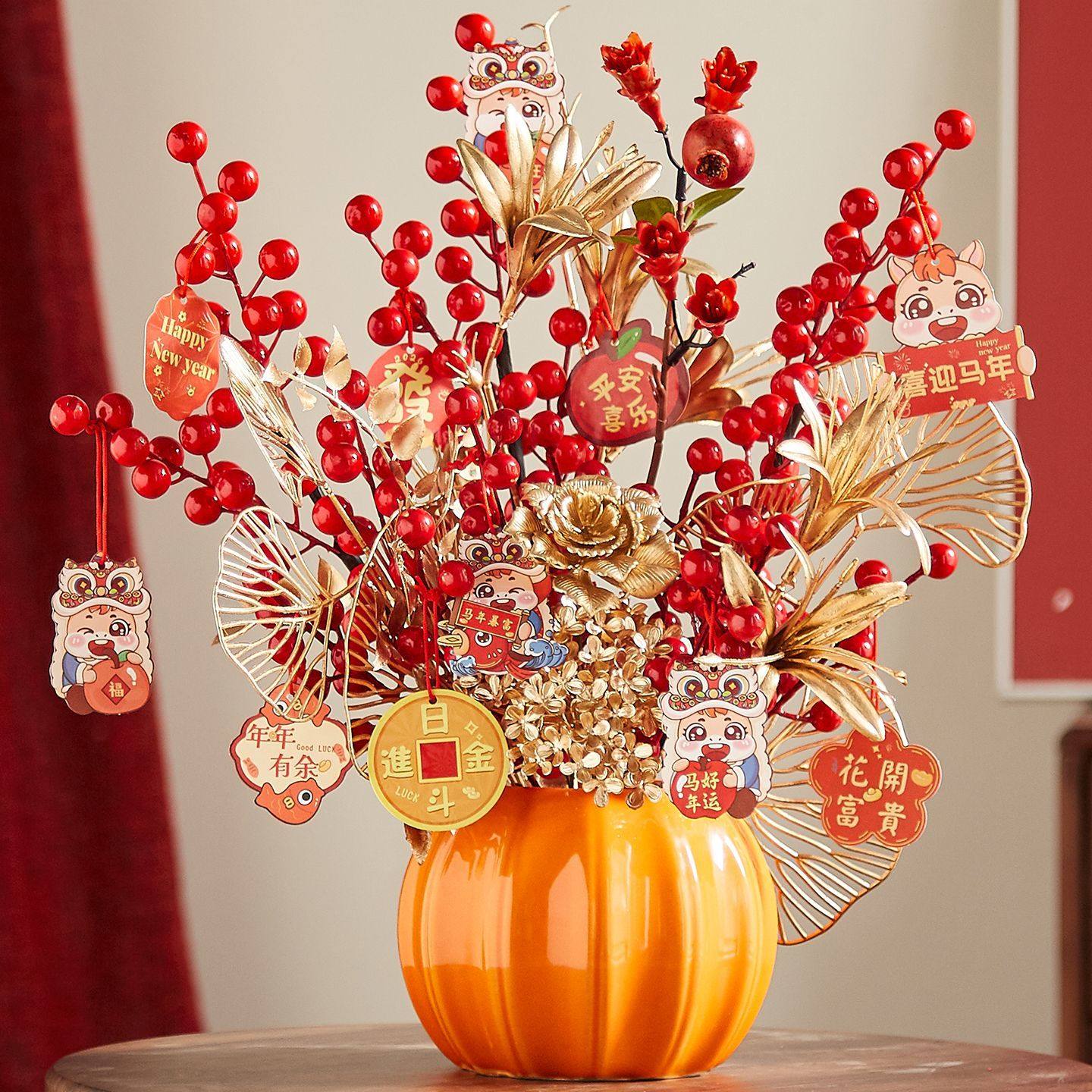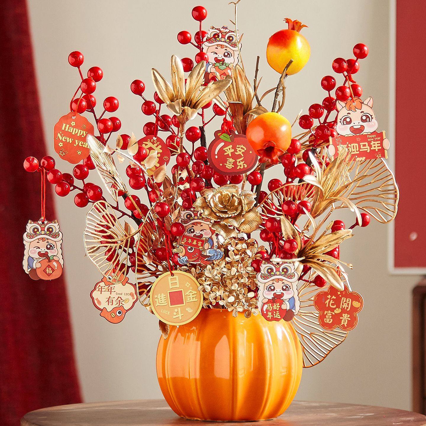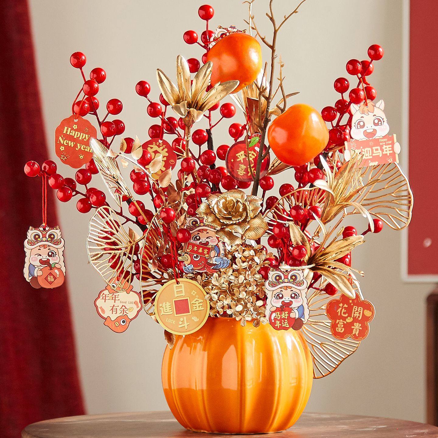 新年过年装饰发财果福桶春节年宵南瓜瓶仿真假花摆件客厅花束红果