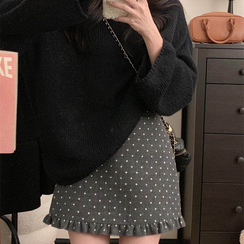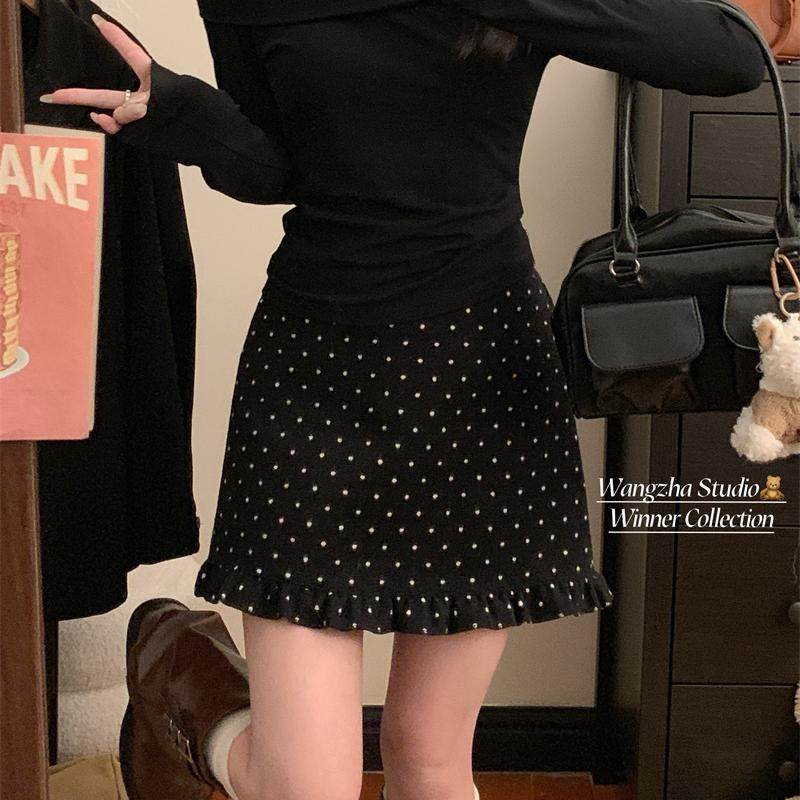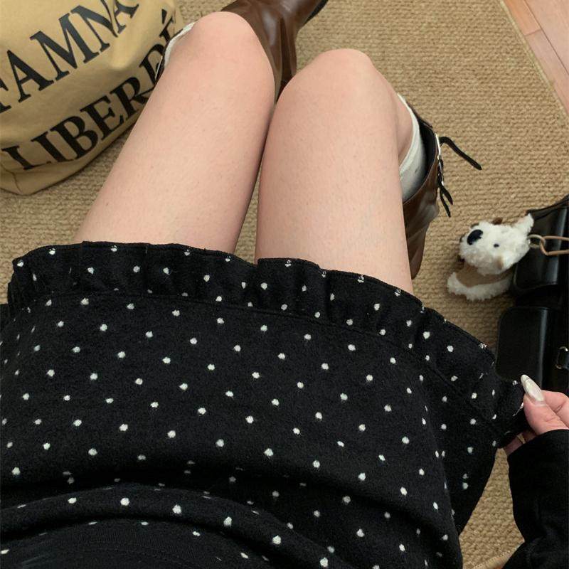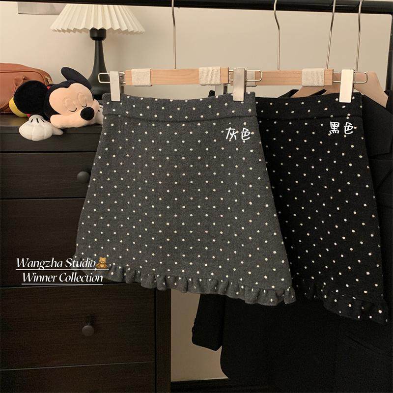 大码灰色波点毛呢半身裙秋冬高腰减龄花边包臀鱼尾裙显瘦A字短裙