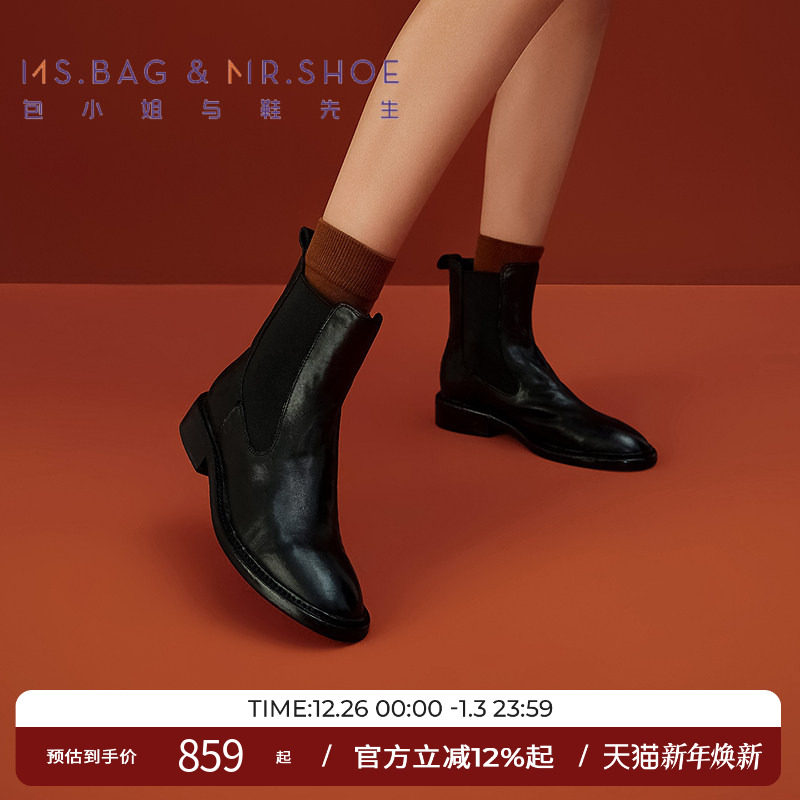 包小姐与鞋先生秋季黑色水洗马皮平跟短靴女244150