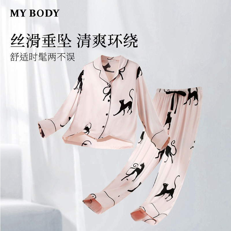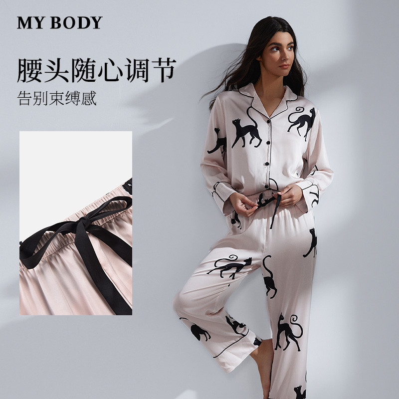 MYBODY商场同款睡衣女套装时尚黑猫印花缎面可外穿长袖家居服套装
